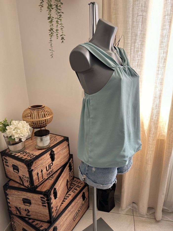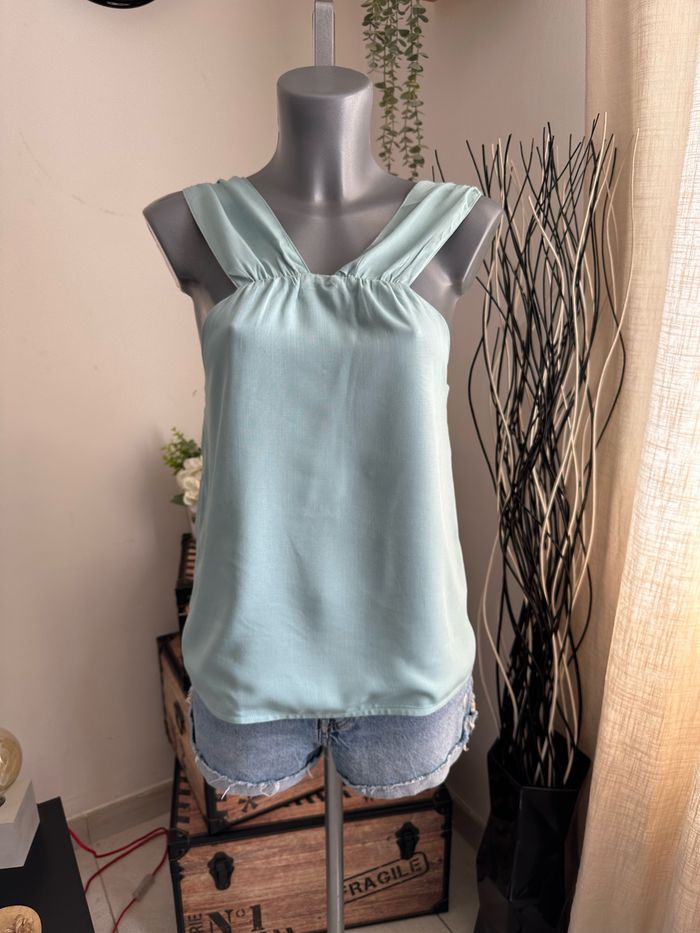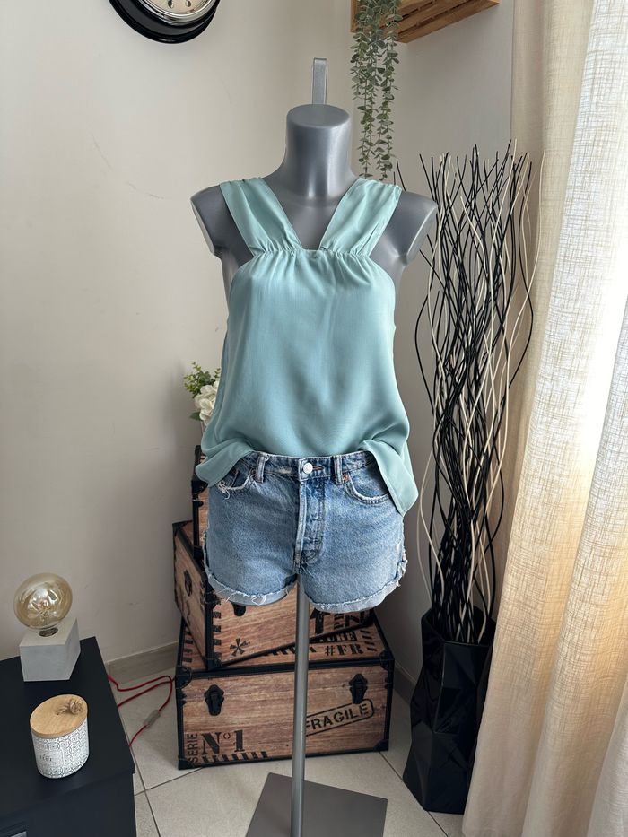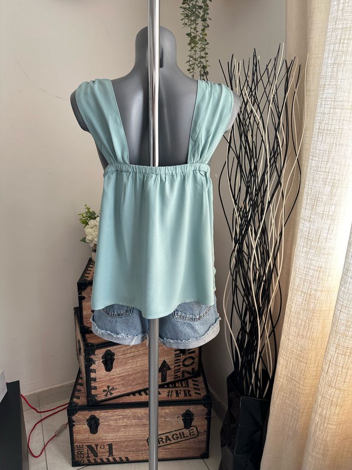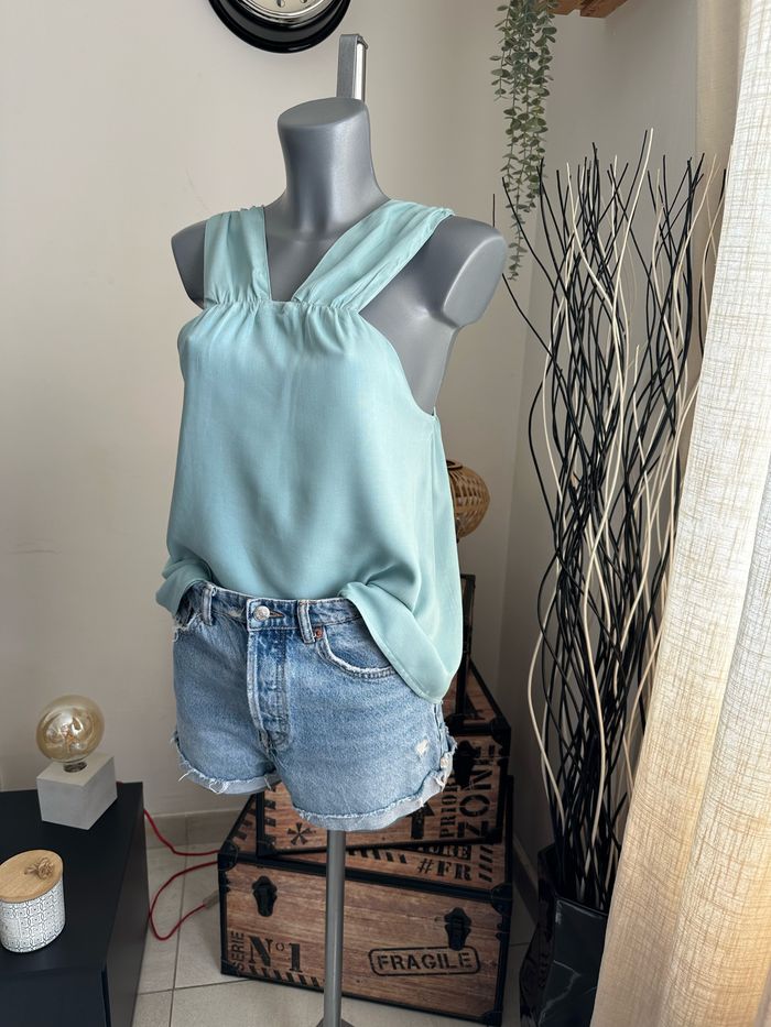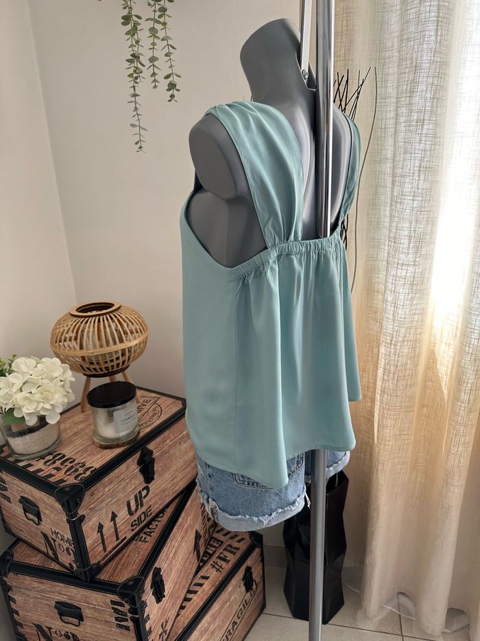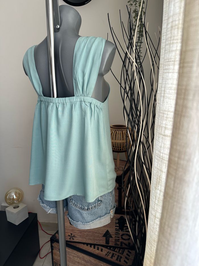 Haut bleu gris clair , bretelles larges , doublure intégrée, coupe droite , dos légèrement échancré Taille 34. Kiabi. Seconde main en excellent état