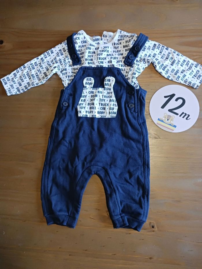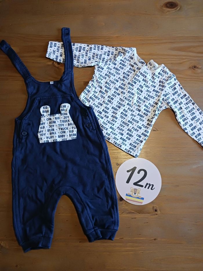Ensemble salopette longue bleu marine et t-shirt manches longues blanc avec inscriptions noires 12 mois