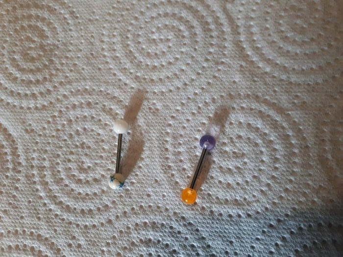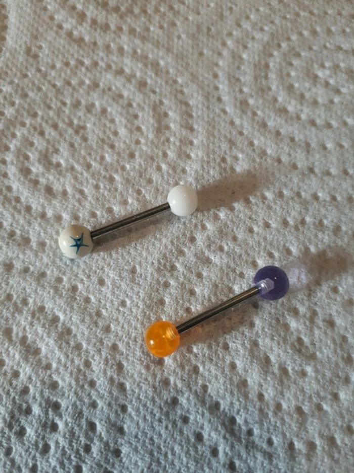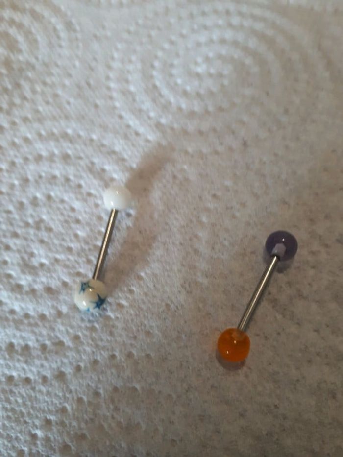1 piercing avec 1 boule orange et 1 boule violette 1 piercing avec 1 boule blanche et 1 boule blanche et bleu Dimension 2,7cm de long En très bon état