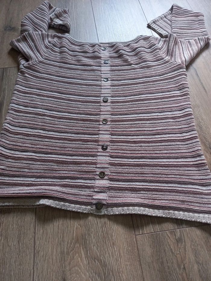 Pull à rayures et faux bouton dans le dos.