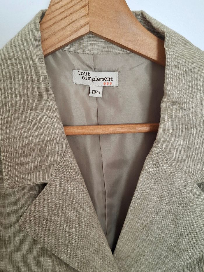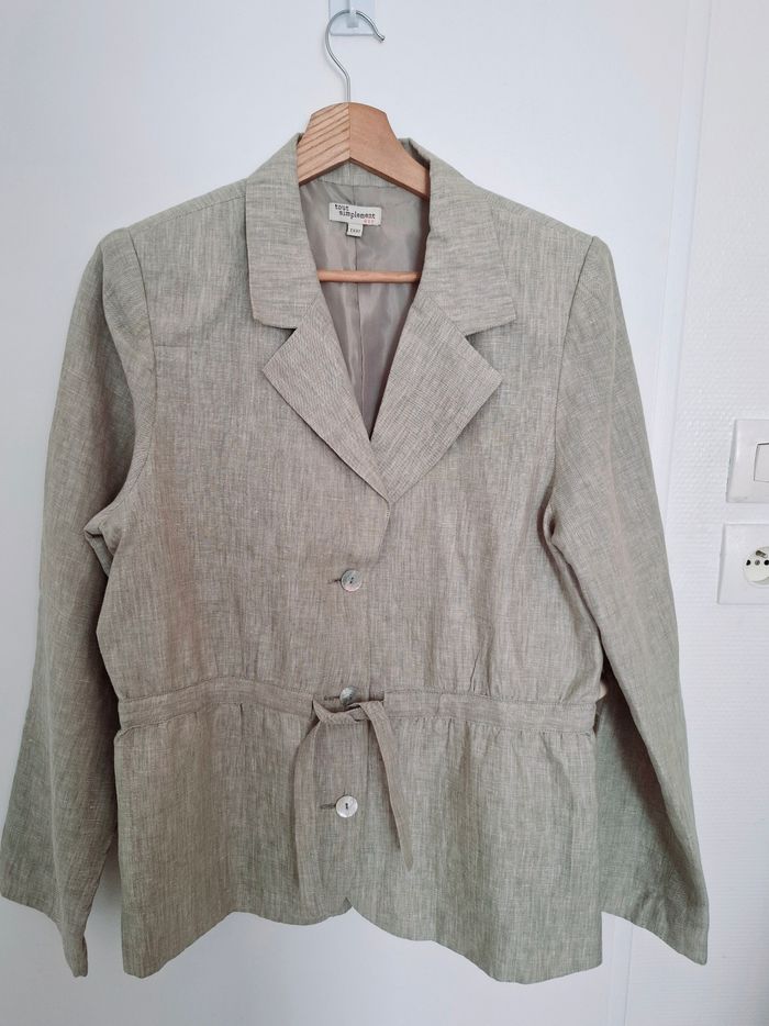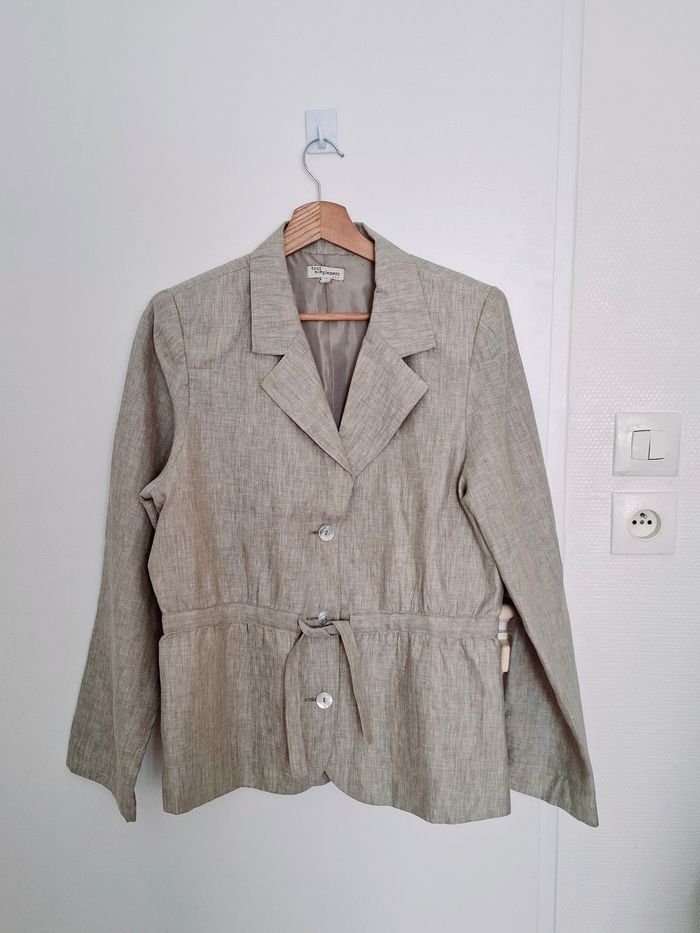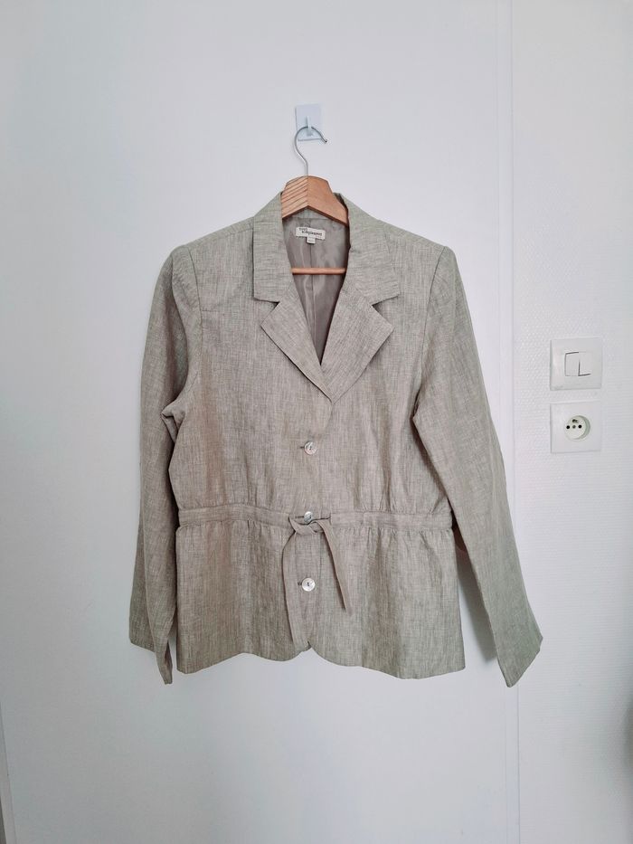 Jolie veste en lin manche longue couleur entre gris et kaki. Avec un jean bleu ou pantalon noir ou blanc qui ferai l'harmonie pour un beau look.