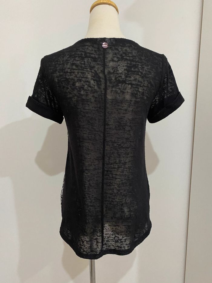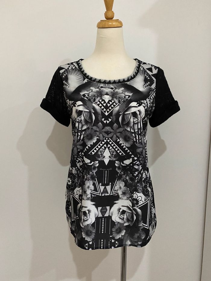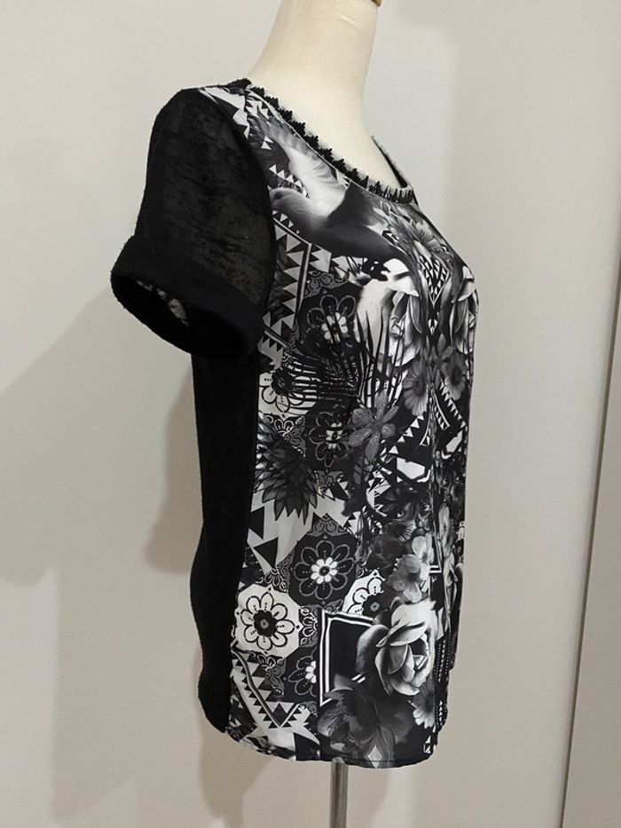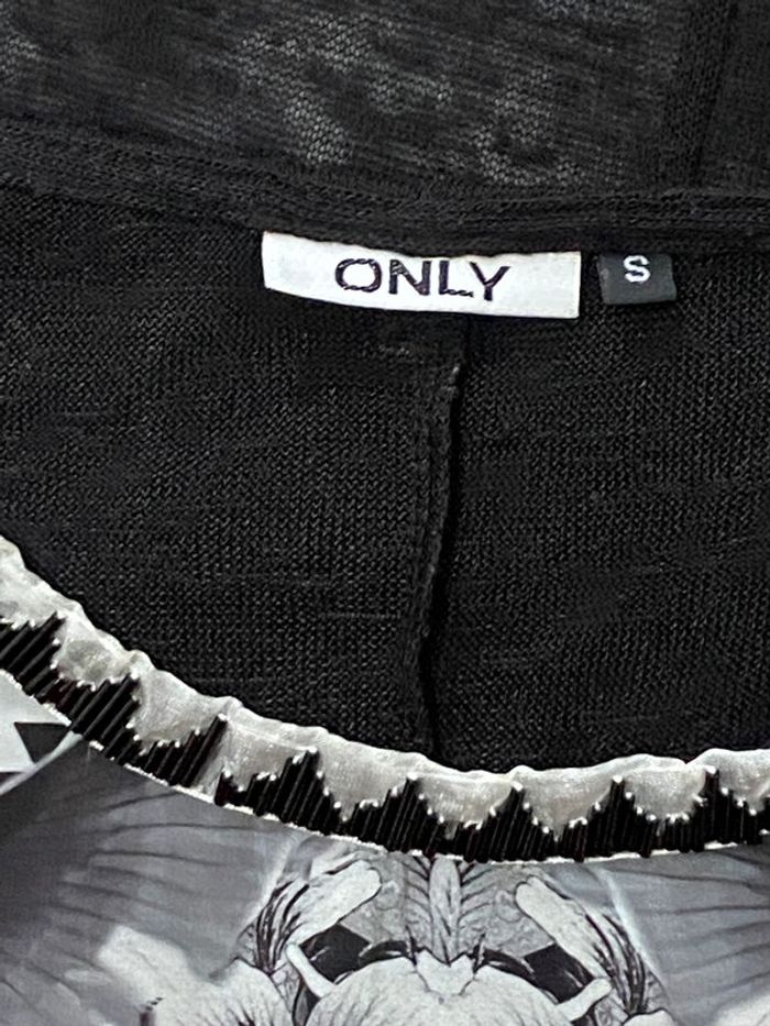 Top blouse noir imprimé fleurs blanches ONLY Très bon état Taille S Décoration perles noires Bi matière, dos transparent #JosyshopTop
