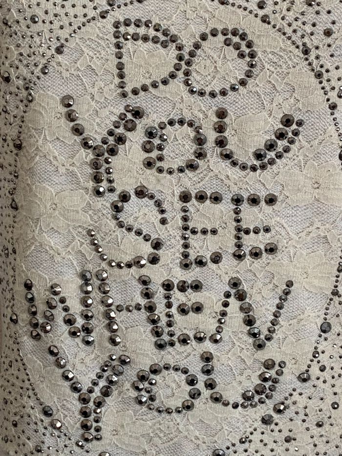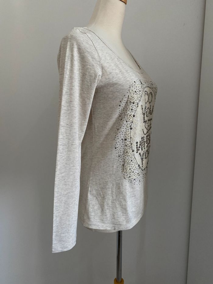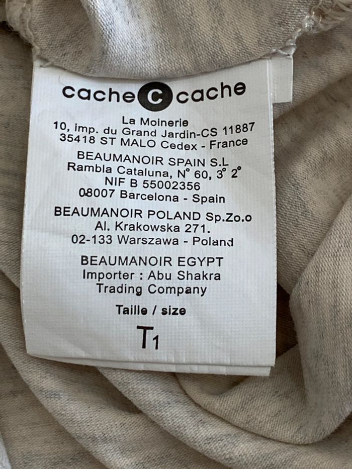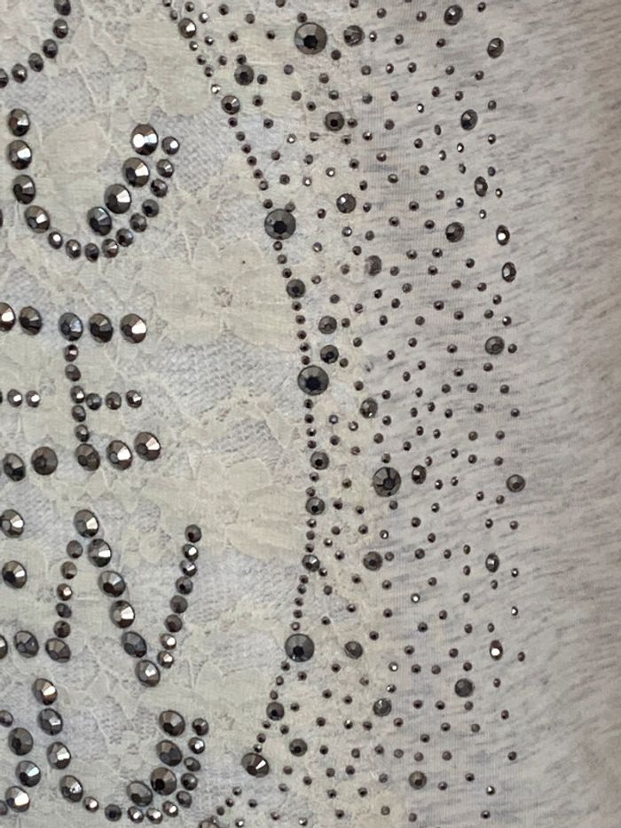 T-shirt beige moucheté Cache Cache En parfait état Taille 1 Texte "Do you see when you" Avec de jolis strass Crème moucheté gris 95% Coton et 5% Elasthanne #JosyshopTeeshirt