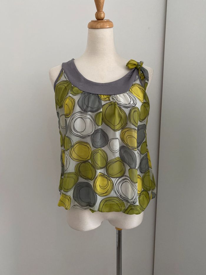 Top blouse vert imprimé CACHE CACHE Bon état Taille 36 Quelques fils tirés mais pas trop gênants Tissu fluide doublé