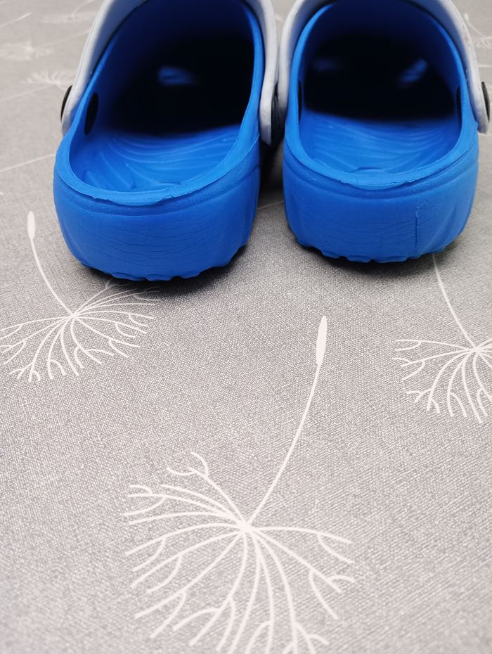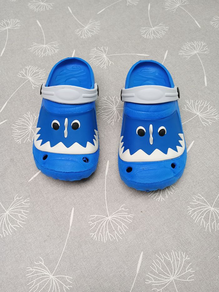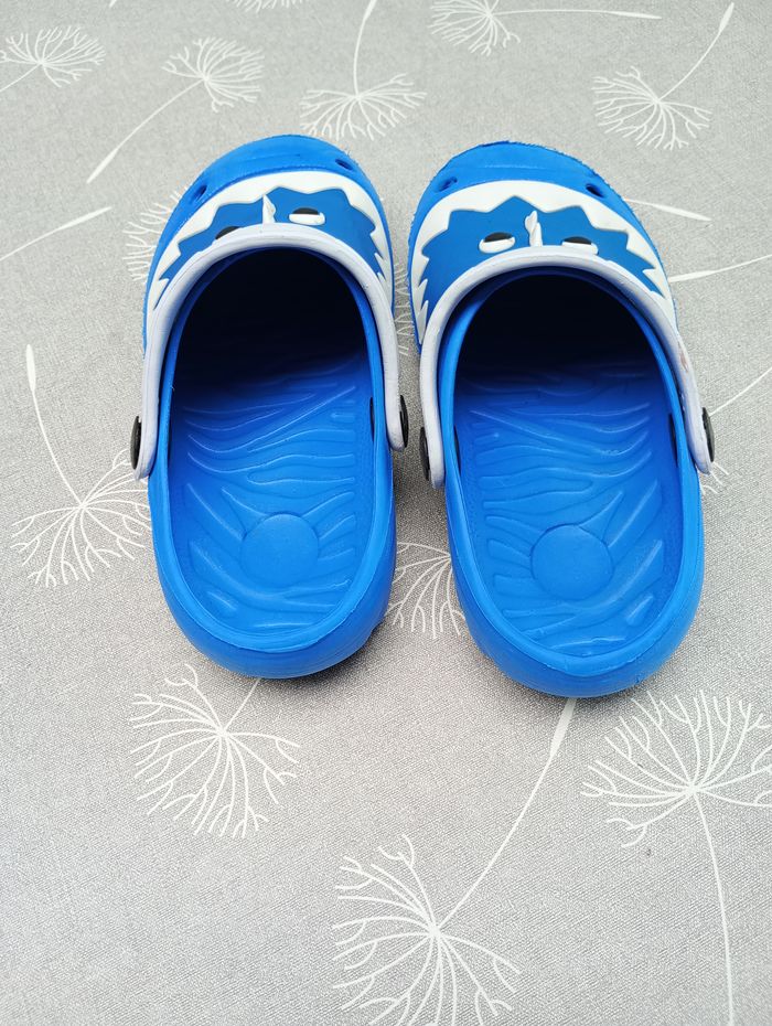 Sandales type "crocs" bleues dinosaures. Pointure 28. Pas de marque. Bon état.