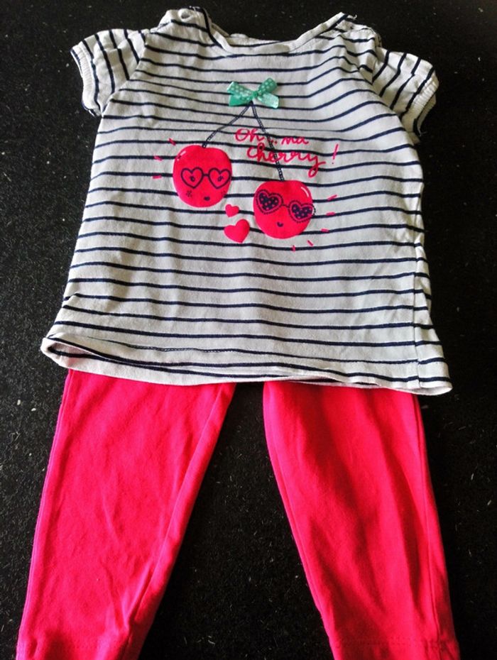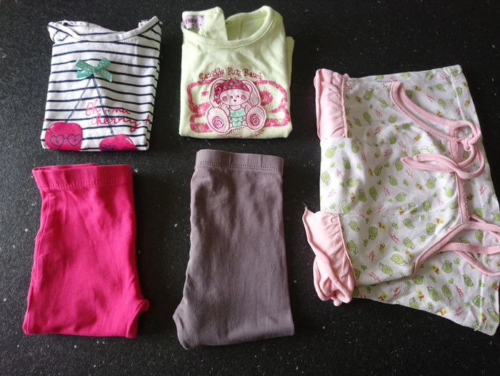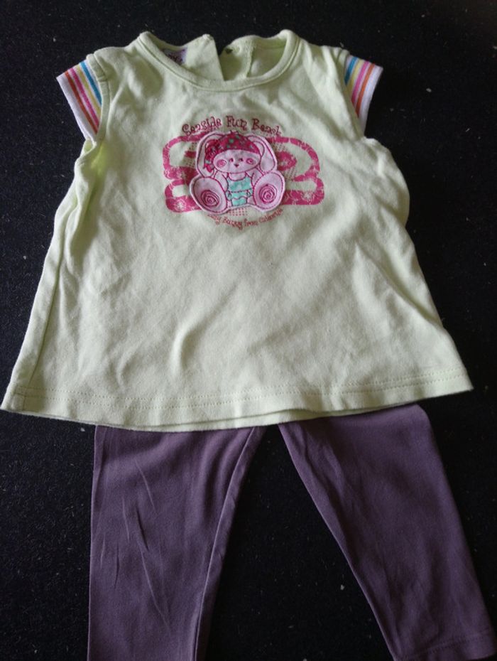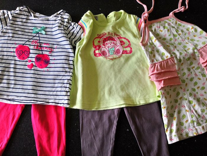 Lot fille d'été 12 mois comprenant 3 tenues : une robe de plage à petits volant, 2 legging court avec t-shirts assortis pas abîmés #delp36_12mois