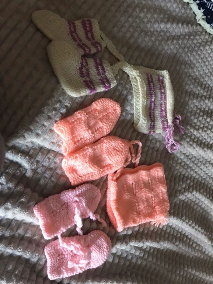 Lot de bonnets et moufles en laine fait main Pour premiers mois