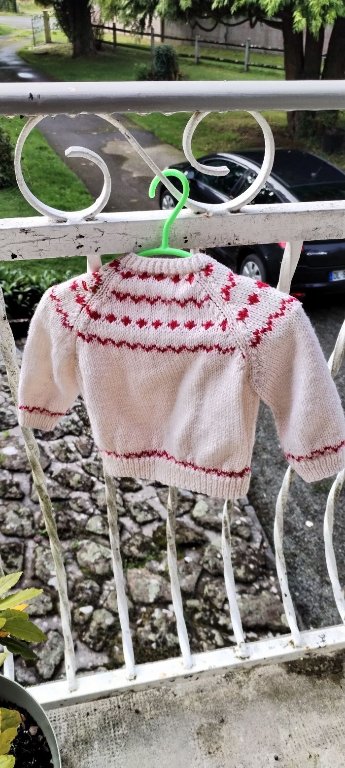 Gilet écru et rouge pour fille. Marque Fait Maison. Taille 6 mois. Comme neuf. Que mondial relais ou Relais Colis.