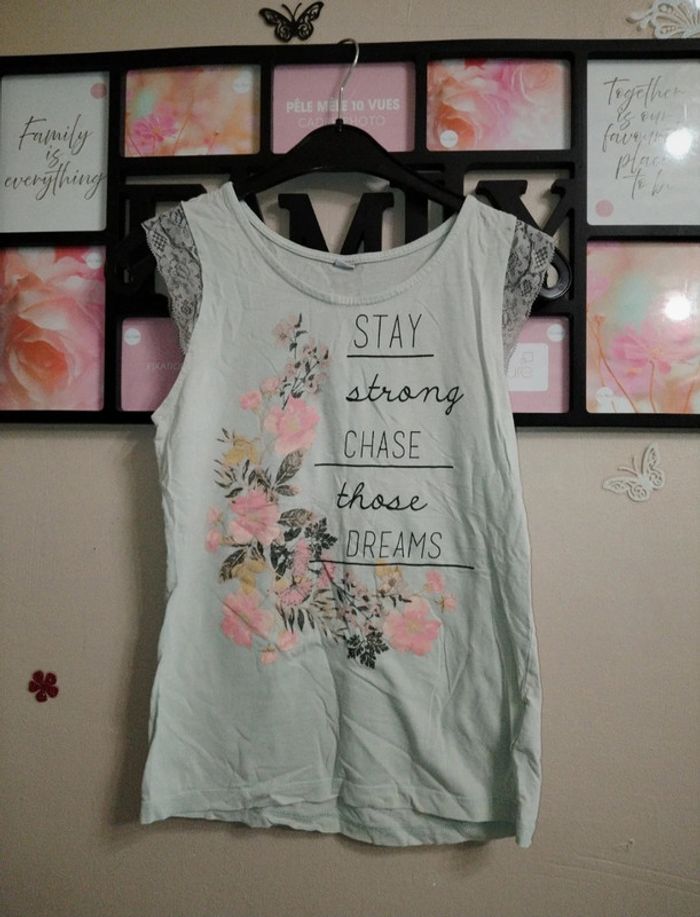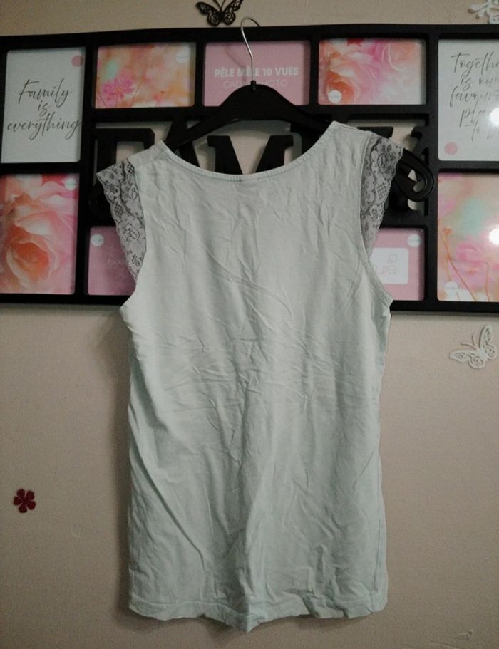 Joli t-shirt manches courtes avec dentelle Taille S 36 Couleur vert d'eau Très bon état Envoie rapide et soigné Réductions activées N'hésitez pas à faire des lot