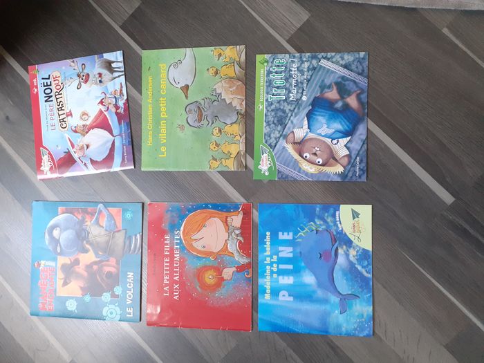 Divers livres pour enfant. Titres disponibles : Le manège enchanté - le volcan, La petite fille aux allumettes, Madeleine la baleine a de la peine, Le Père-Noël catastrouf, Le vilain petit canard, Trotte marmotte - et moi je sers à quoi ? Petit format Couverture souple Illustré Bon ou très bon état