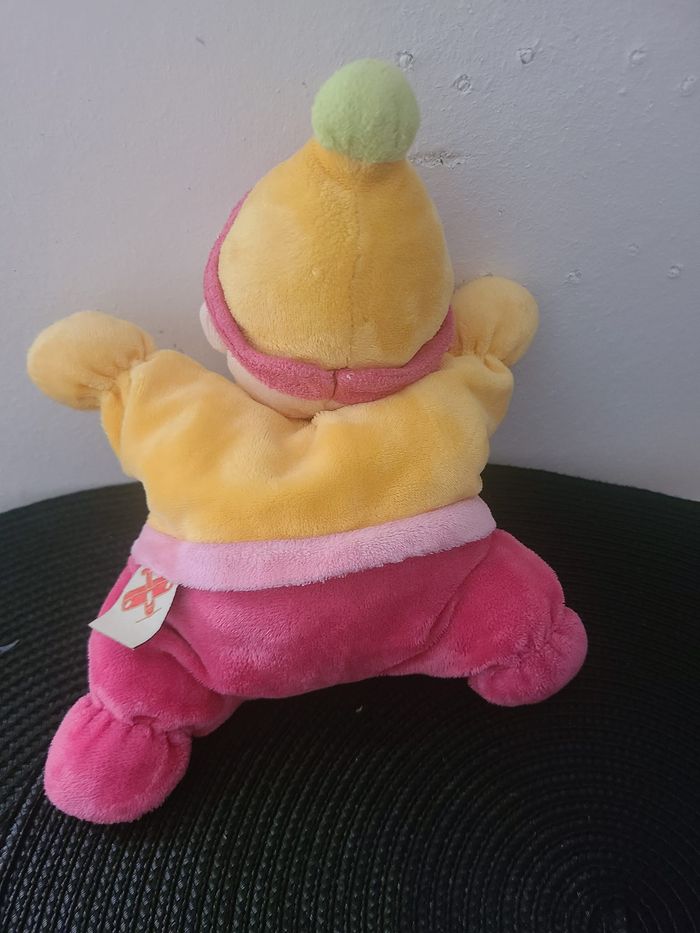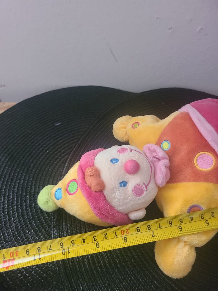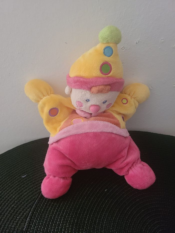 Doudou semi plat clown NICOTOY lutin rose jaune grelot