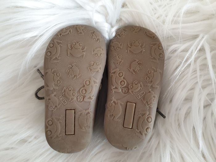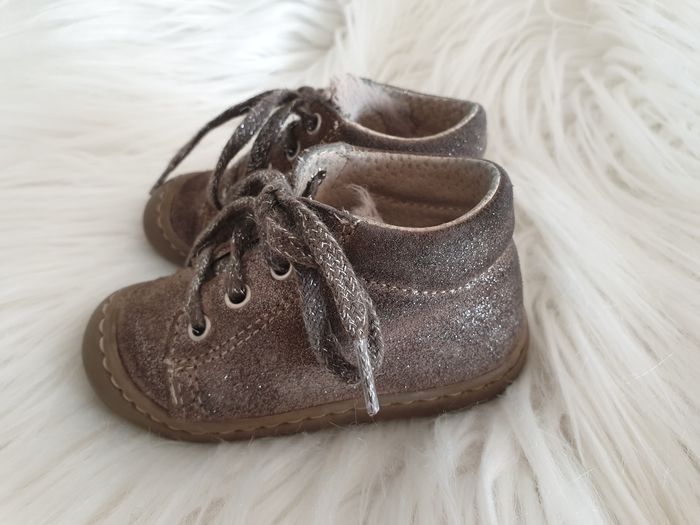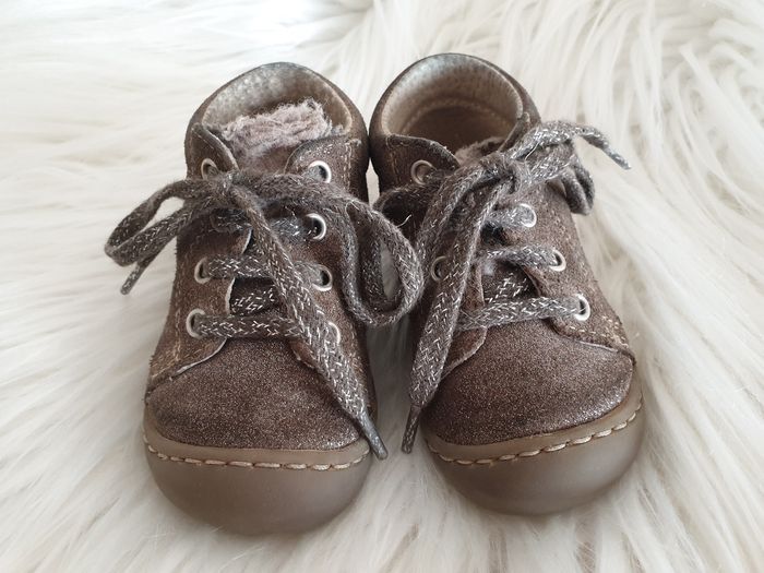 Chaussures souples idéal pour les premiers pas de bébé. Elles sont en très bon état. Il y a juste la petite moumoute sous les lacets qui est un peu écrasée à force de serrer les lacets (mais cela ne se voit pas vu que c'est en dessous). Elles sont couleur bronze à paillettes.