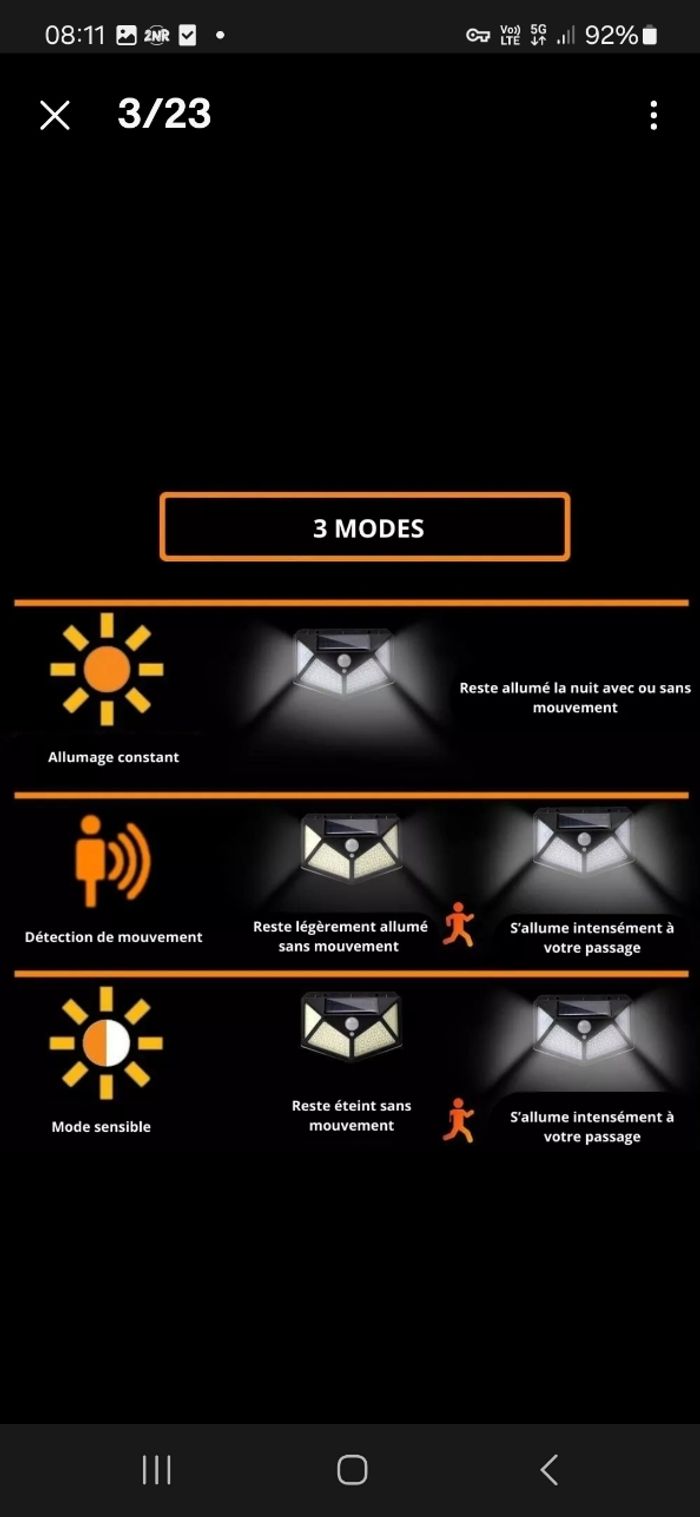 Description 👍 -lampe solaire 100 led -Détecteur de mouvemet -économique -éclairé très fort - se recharge même lorsqu'il fait nuageux -3 mode d'éclairage possible 9€ l'un 16€ les 2