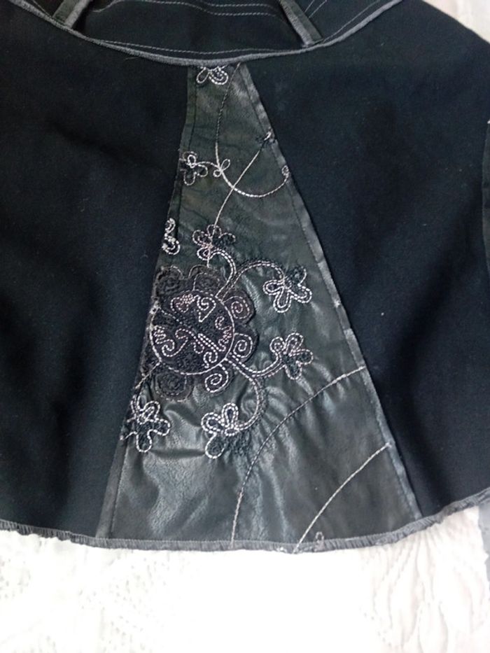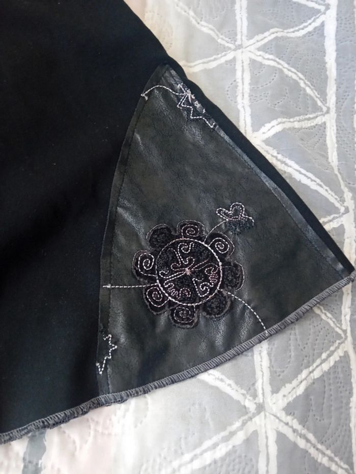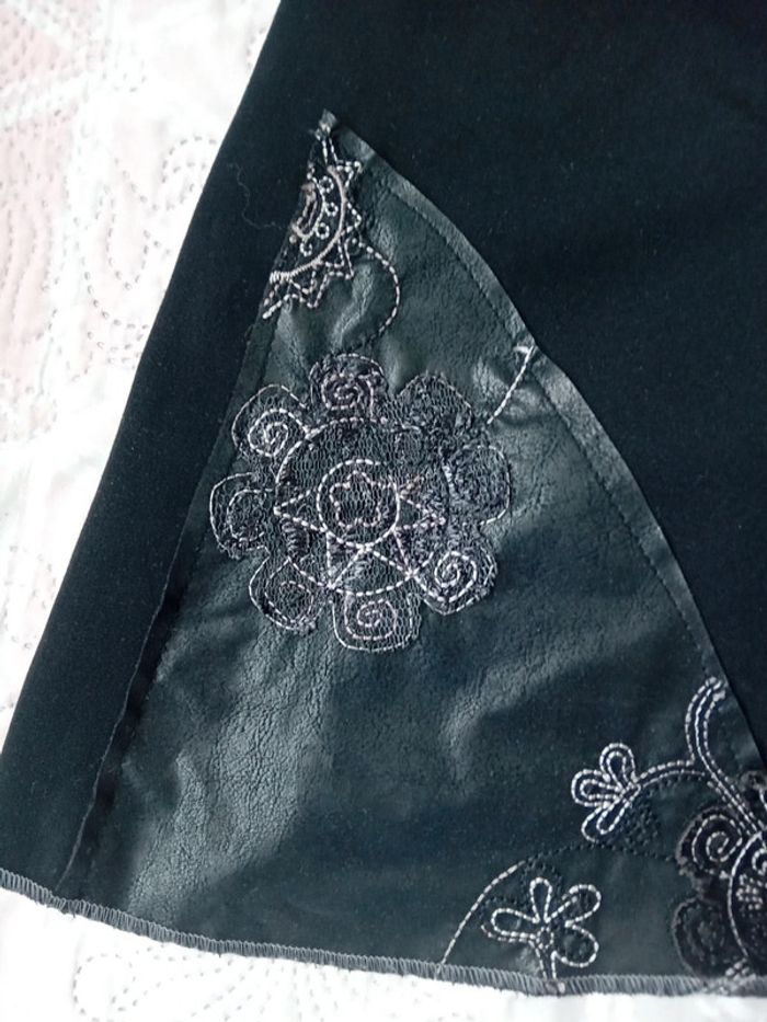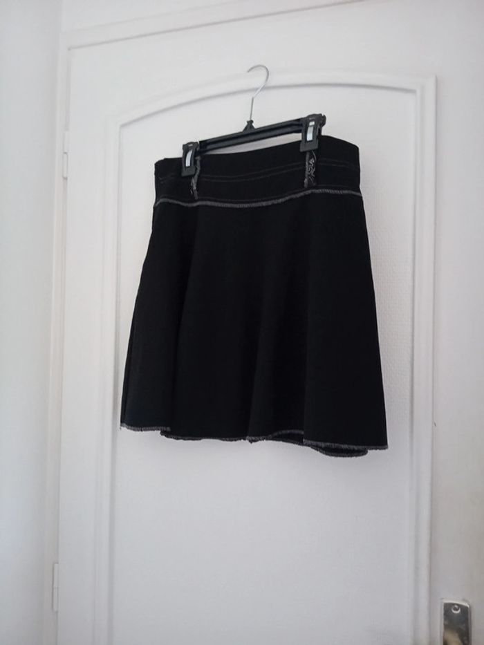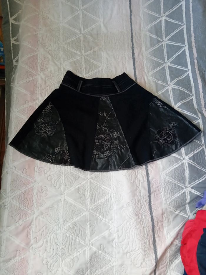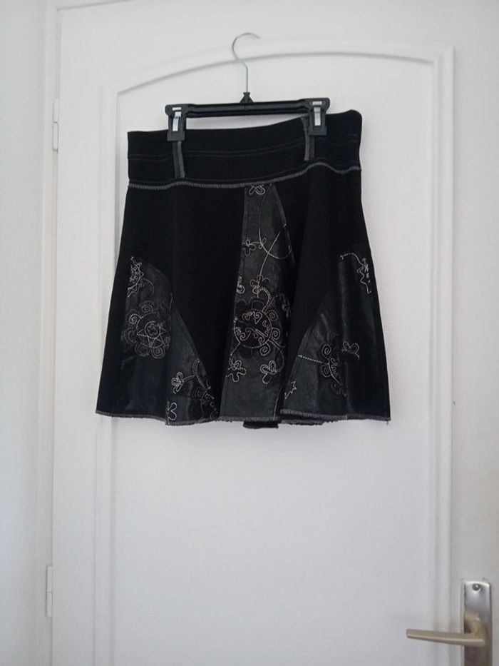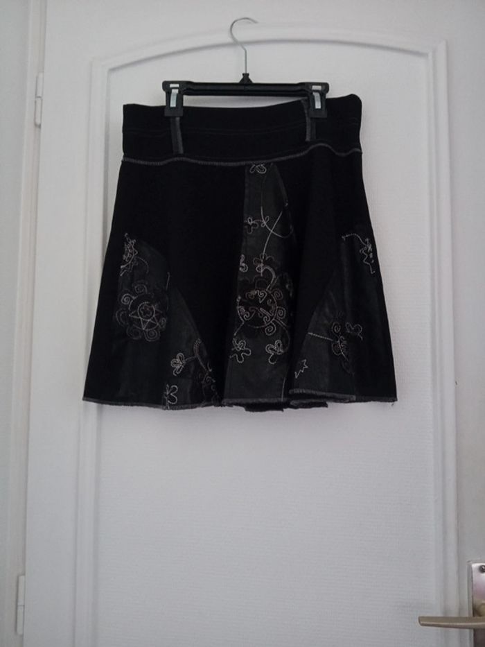 Jupe courte valseuse en polyester et elastanne avec broderies motif floral en simili cuir fermeture éclair sur le côté longueur 45 cm largeur hanches 37 cm largeur taille 35 cm passants pour mettre une ceinture très peu portée en très bon état #midole #midolefemme38 #midolefemme #jupefemme38 #jupebimatiere #jupesimilicuir #jupeavecbroderies #femme38 #jupevalseuse