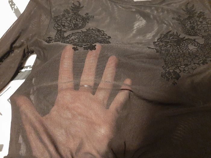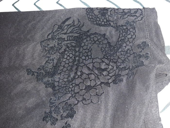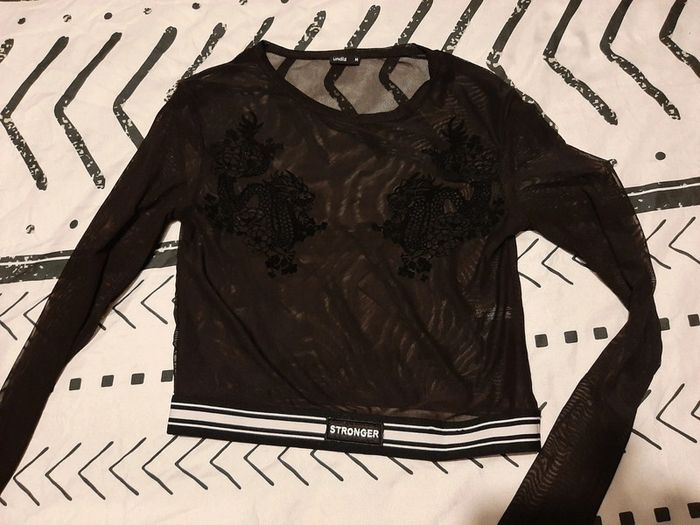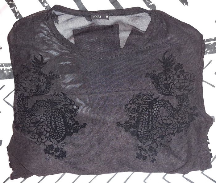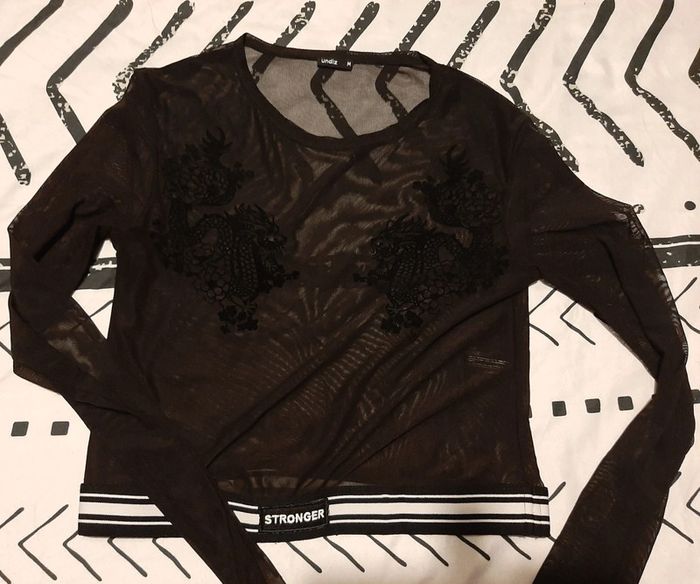 Joli haut noir, en transparence, avec des motifs dragon . Beau rendu porté ! Avec un petit débardeur dessous par exemple... En excellent état. N'hésitez pas à aller faire un tour dans mon dressing de nombreux autres articles à vendre à des tout petits prix et prix dégressif sur les lots 🙂🌸 je reste disponible pour toutes questions.