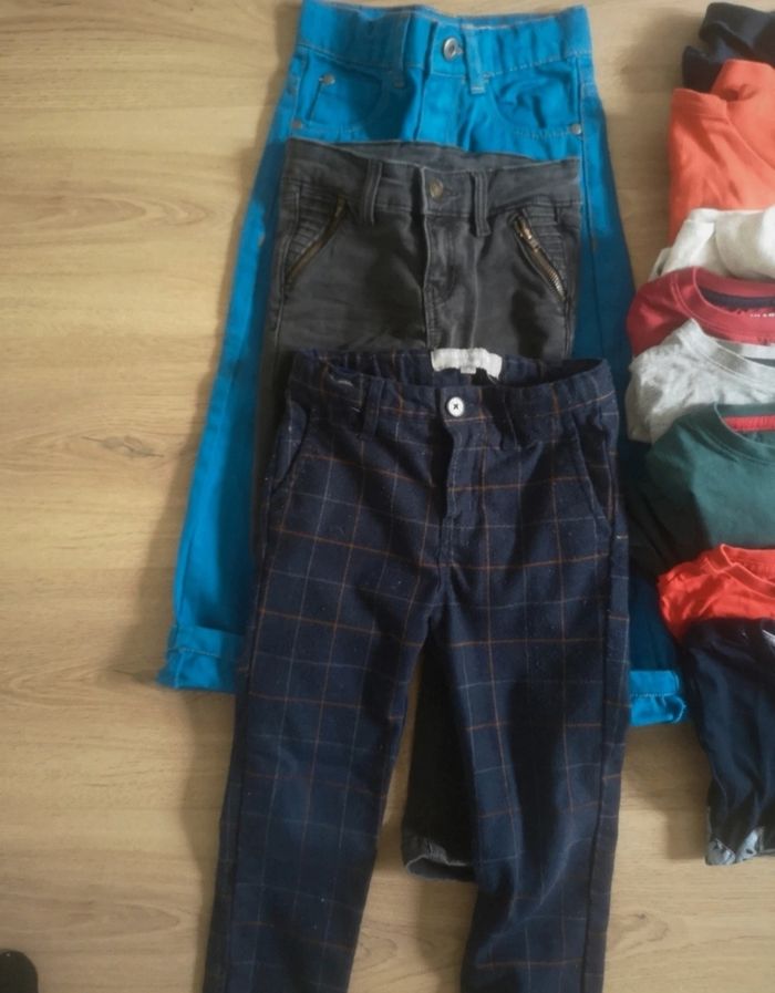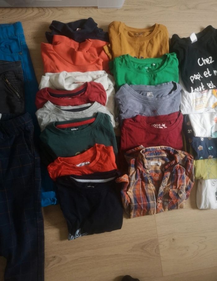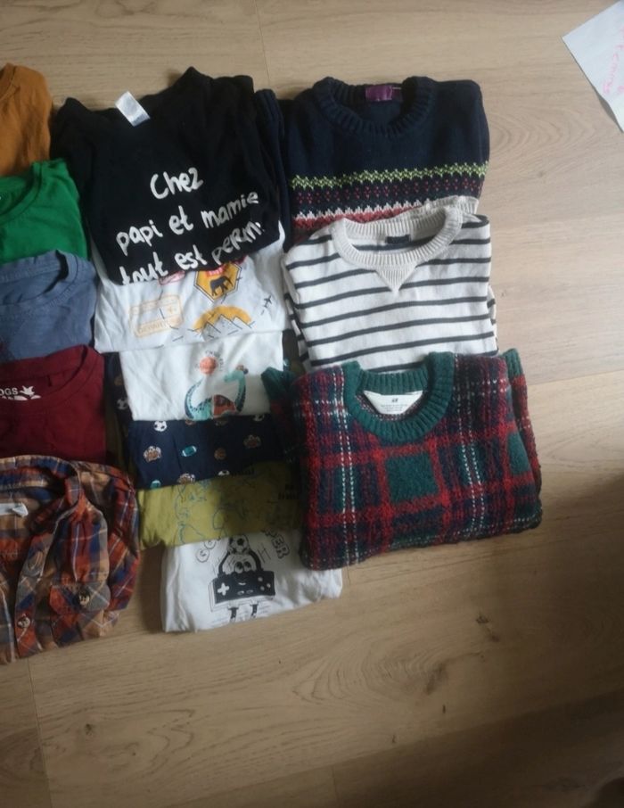 Tout est en très bon état. 3 pantalons 9 tee shirts manches longues 2 sous pull 1 chemise 6 tee shirts 3 pulls