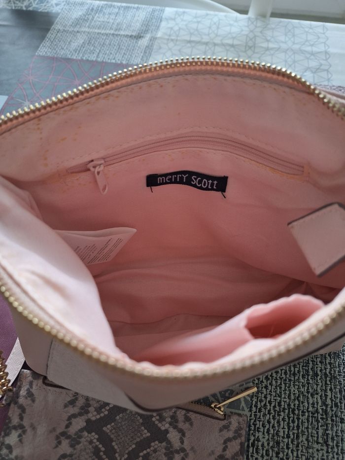 Très beau sac à main, bandoulière réglable avec porte-monnaie de 16 x 13 cm, assorti, en très bon état Simili rose poudrée, pochette en daim sur le devant Pochette avec fermeture éclair à l'arrière Fermeture éclair doré, sur le dessus du sac pour le fermé. Quelques micro tâches à l'intérieur voir photo Largeur du sac 26 cm Profondeur 6 cm Hauteur 19 cm