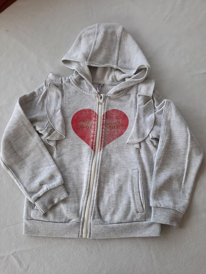 Un sweat à capuche en taille 8 ans. Porté par un seul enfant. Très bon état mais cœur rouge un peu délavé.