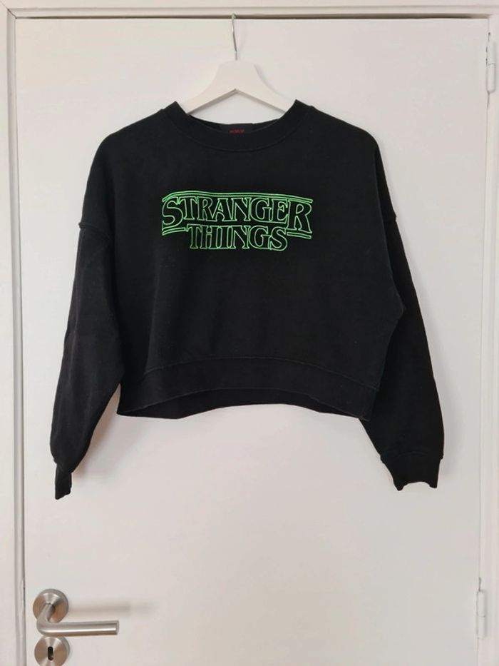 Pull de marque Stranger things Jennyfer ; Ton noir et vert ; Taille XXS / XS ; En bon état (peluche légèrement) #tailleXXS_louanne59430 #tailleXS_louanne59430