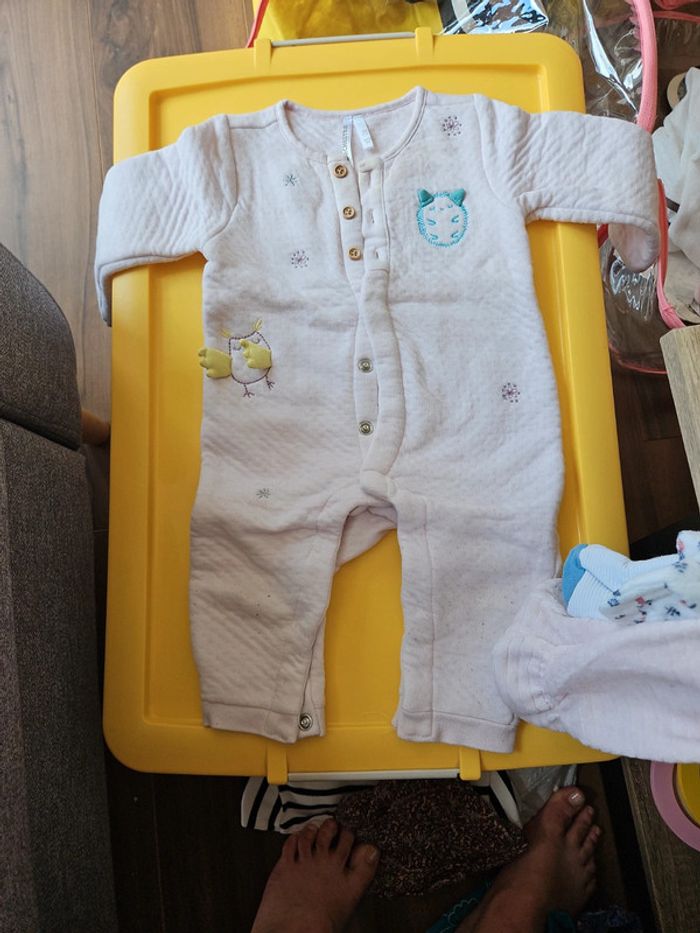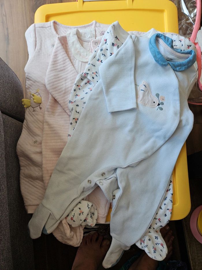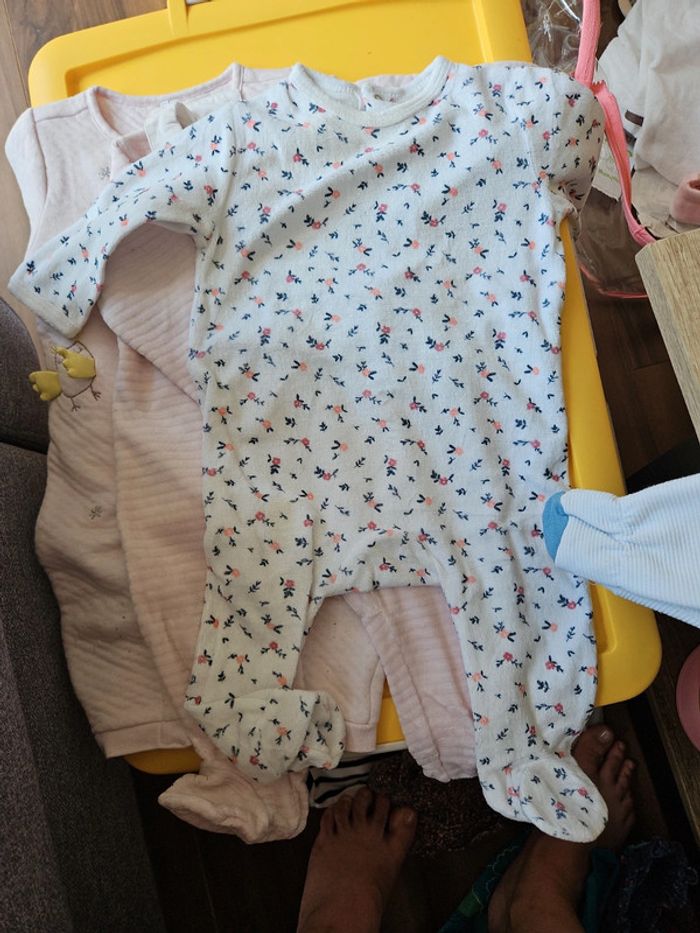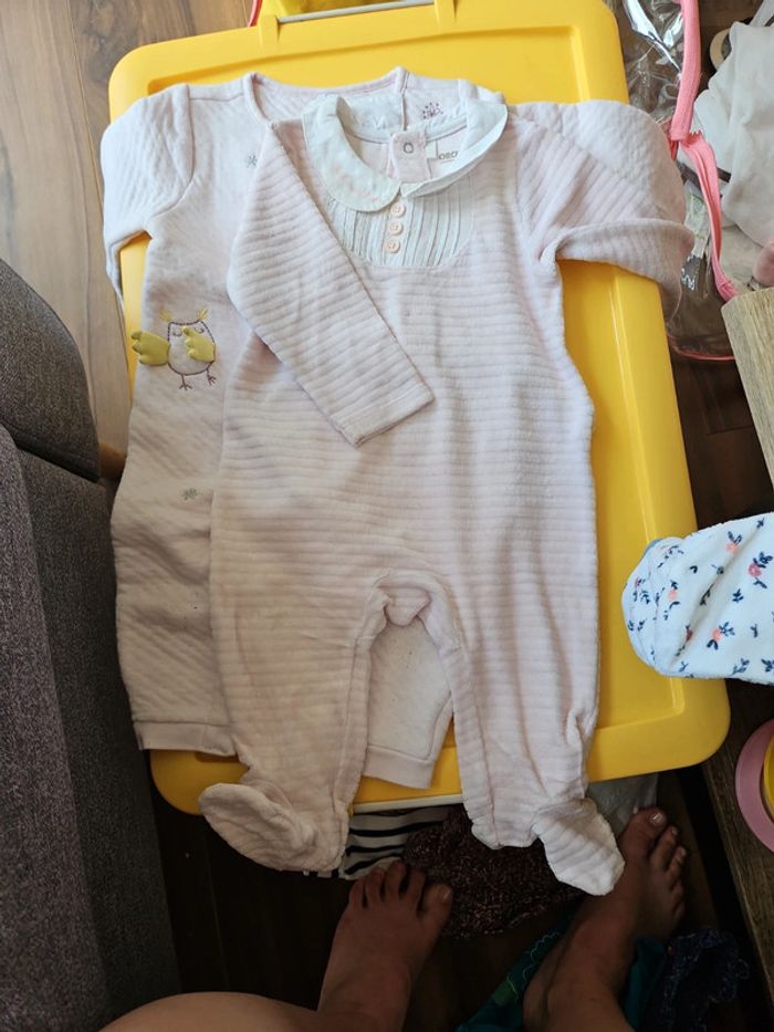 Lot de 4 pyjamas les deux roses sont de la marque orchestra celui a Fleur de la marque kiabi et le blanc de la marque obaibi en taille 6 mois 67 cm