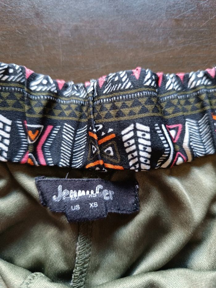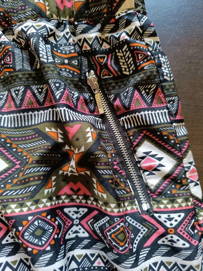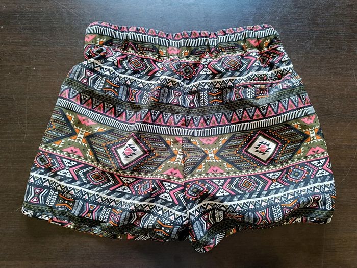 Short JENNYFER Imprimé ethnique coloré (kaki, corail, orangé, noir & blanc) Poches zippées sur le devant Taille élastiquée Doublé 100% Polyester TAILLE XS TRES BON ETAT Allez voir mes autres ventes!