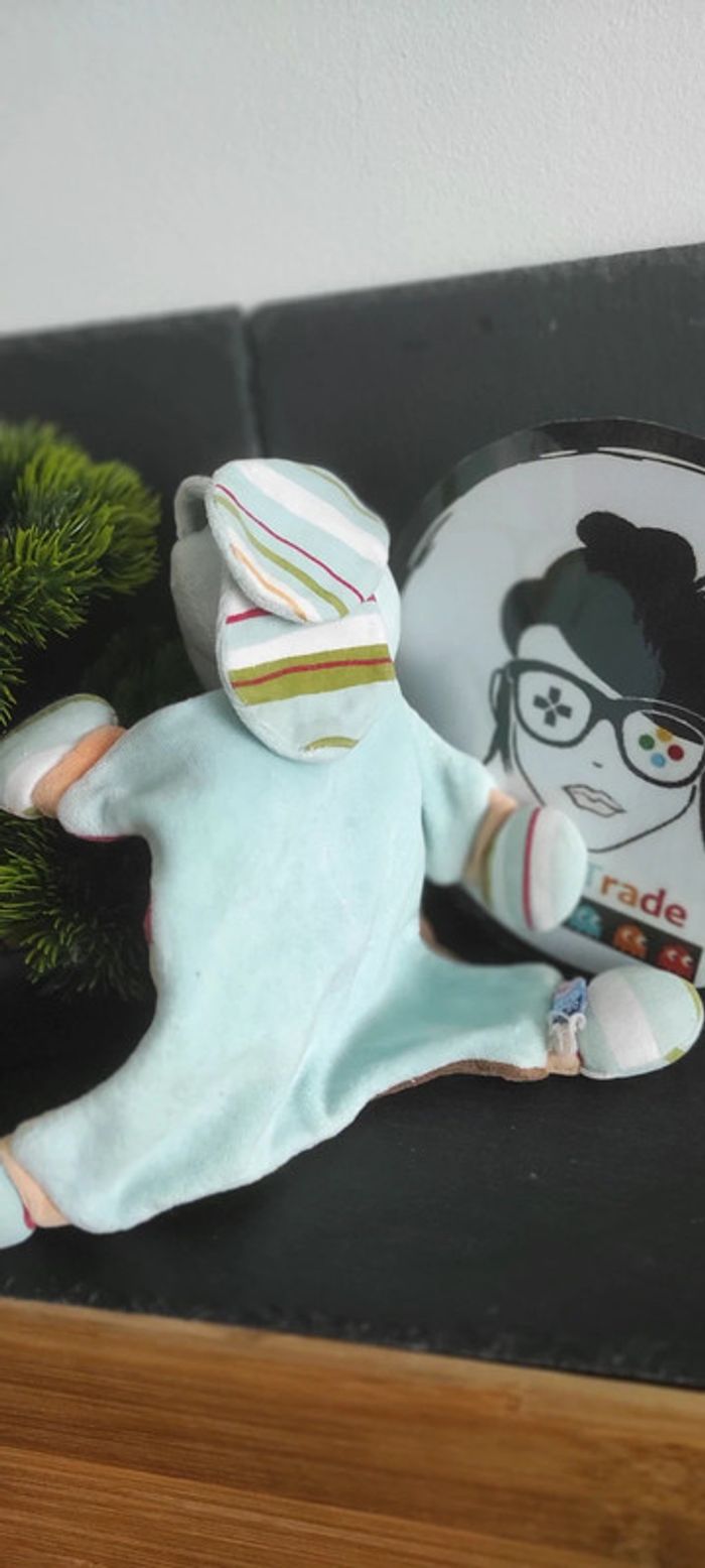 Doudou lapin bleu rouge jaune marron sucre d'orge losange rond spirale Rayé