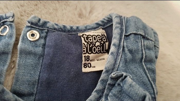 Jolie petite robe en jean souple de chez Tape à l'oeil. Petit noeud en haut à gauche. Fermeture à l'arrière par 3 pressions. Bon état