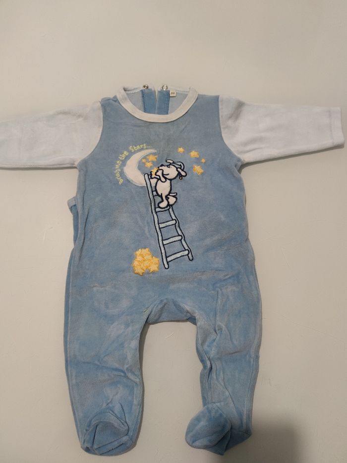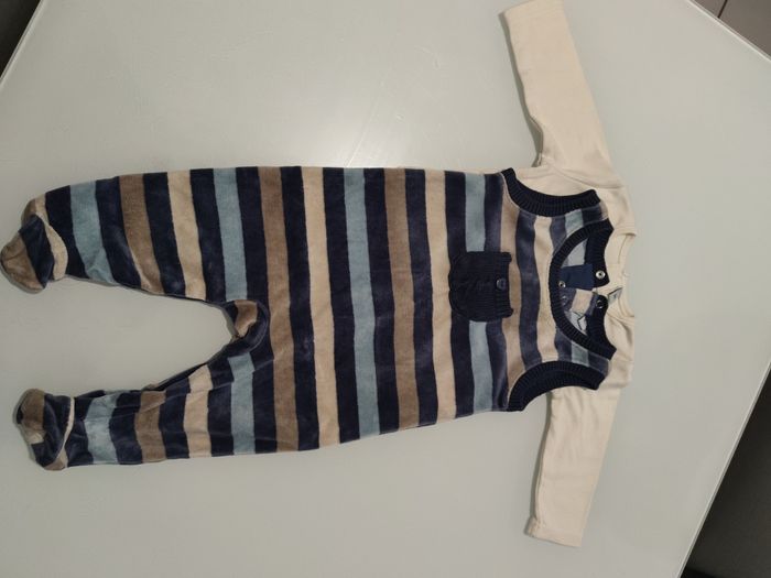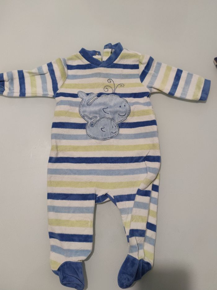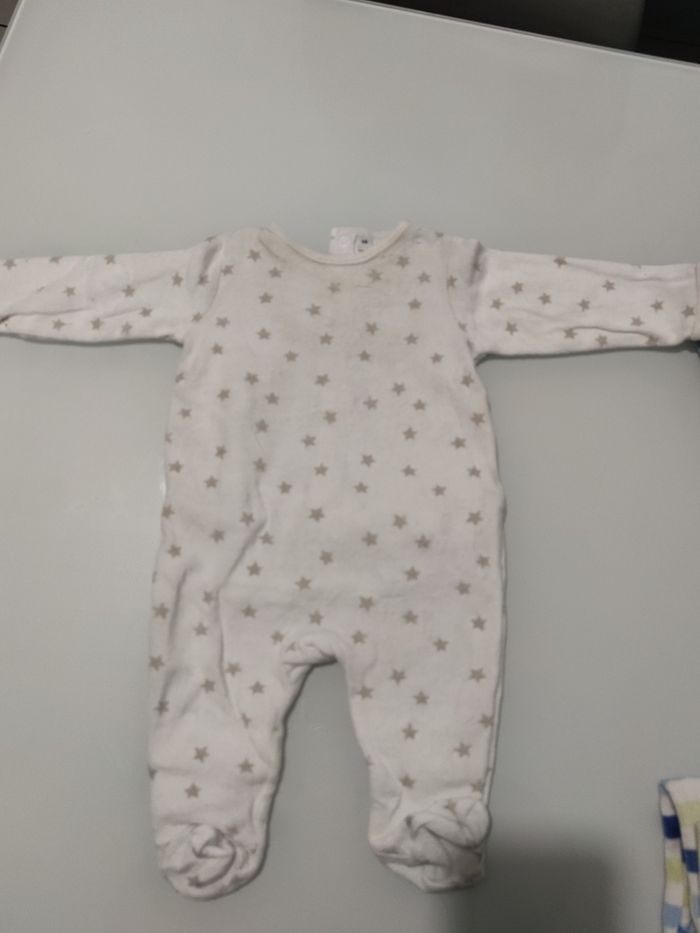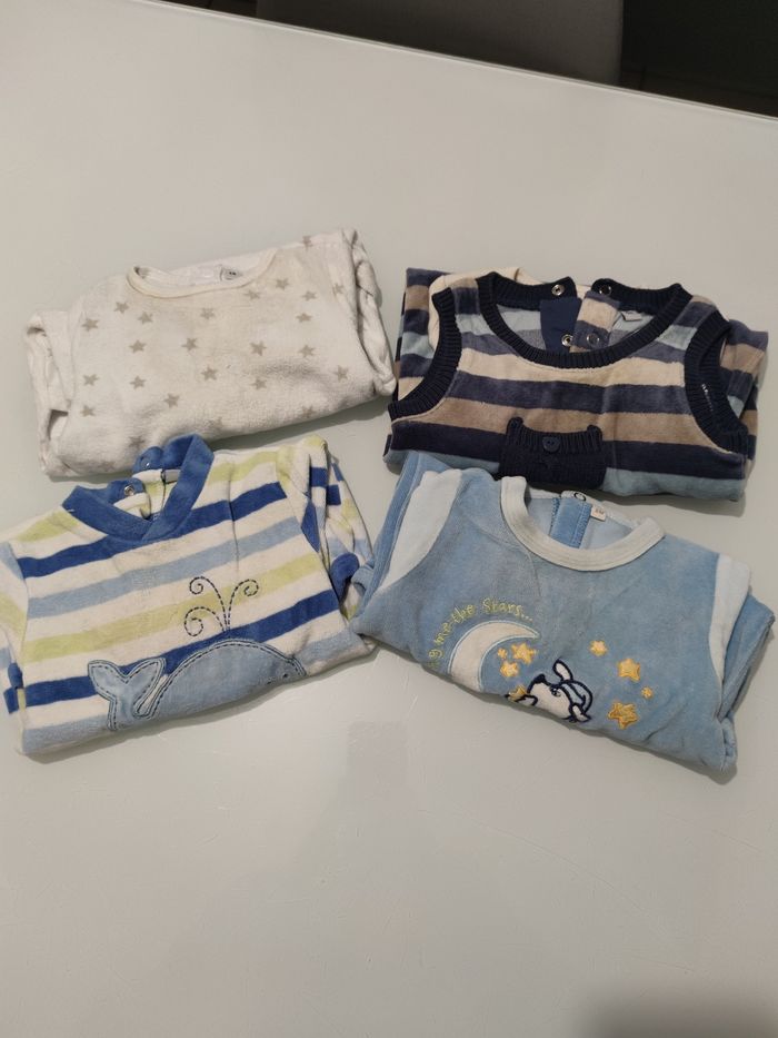 3 pyjamas une pièces et un ensemble pouvant aussi faire office de dors-bien sans le t-shirt. Lot en très bon état sauf le blanc qui a une oreole à l'encolure