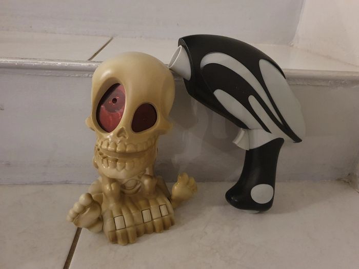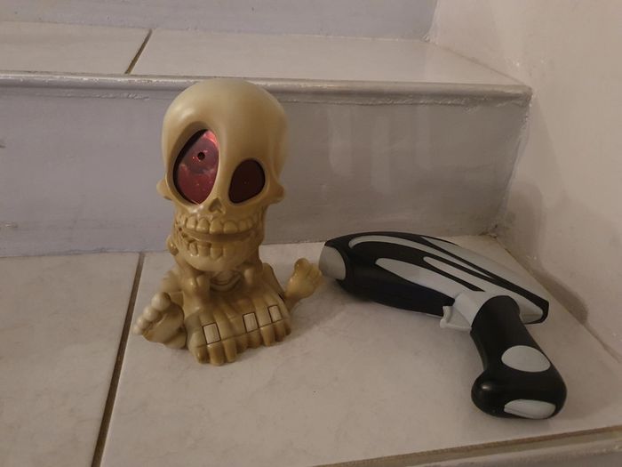 Eteignez la lumière et préparez-vous au grand frisson ! Avec son œil magique, Pablo Crâno projette un à un des fantômes sur les murs, en haut, en bas, devant et même derrière ! A vous de bien viser avec le pistolet laser à 6 coups rechargeable dès qu’un fantôme apparaît (trois niveaux de vitesse pour défier Pablo Crâno). Pour chaque fantôme éliminé, Pablo Crâno crie et c’est un point de marqué ! La séance de tirs dure 90 secondes. Qui fera le meilleur score ? Contenu du packaging: 1 Projecteur électronique Pablo Crâno, 1 pistolet électronique, 1 notice. Complet avec boîte d'origine N'hésitez pas à aller voir mes autres ventes classées par #eloio 😉 #eloiojeuxjouets