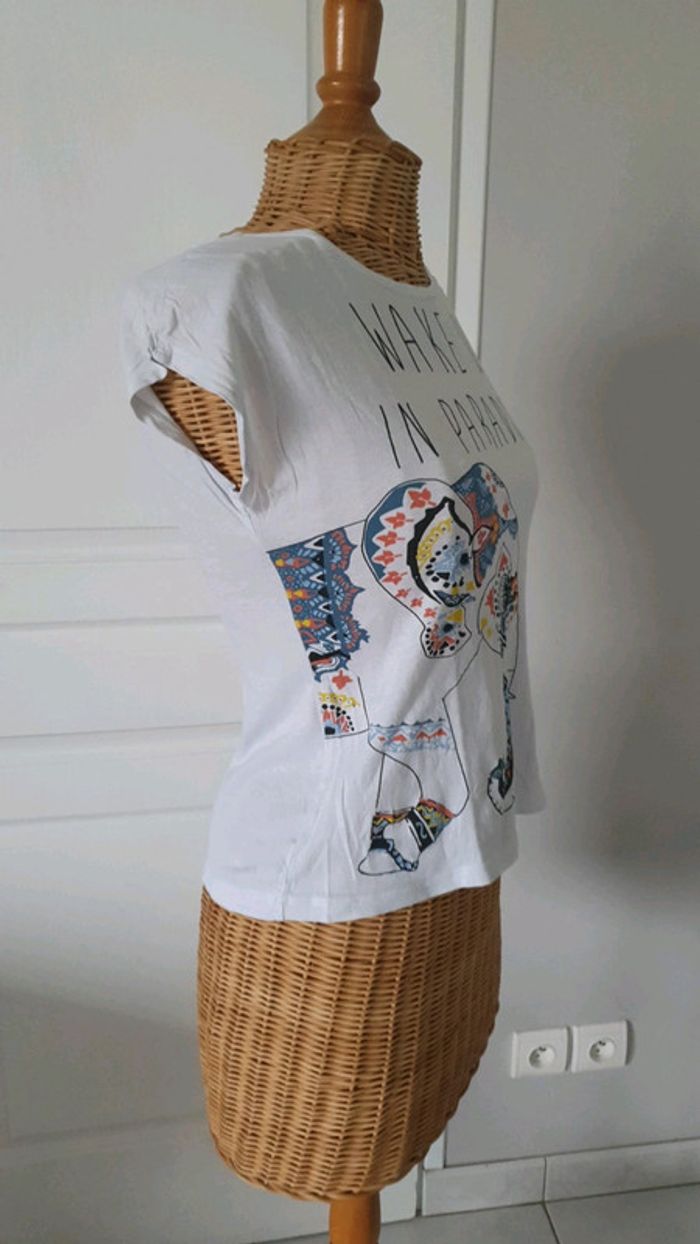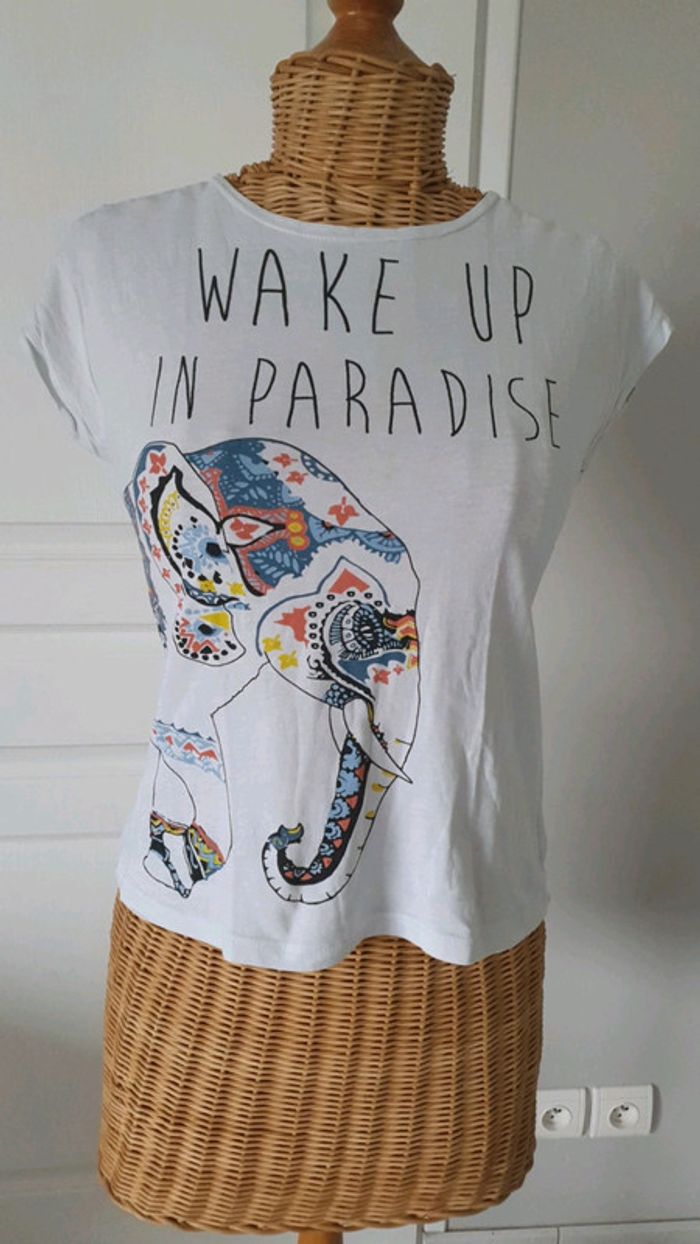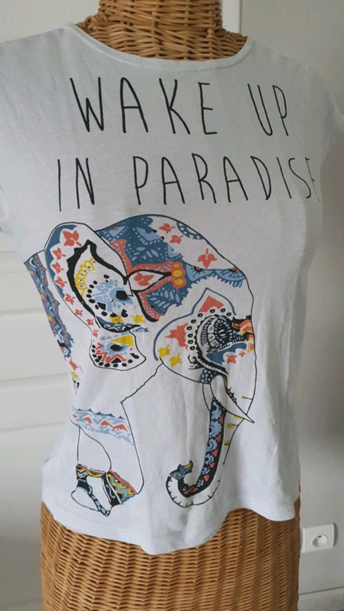 Tee shirt manches courtes femme Motif éléphant Wake up in paradise Mim Possède une petite tâche mais qui ne se voit quasiment pas !cf photo N'hésitez pas à aller voir mes autres ventes classées par #eloio #eloiofemmes #eloiofemme #eloiofilleado