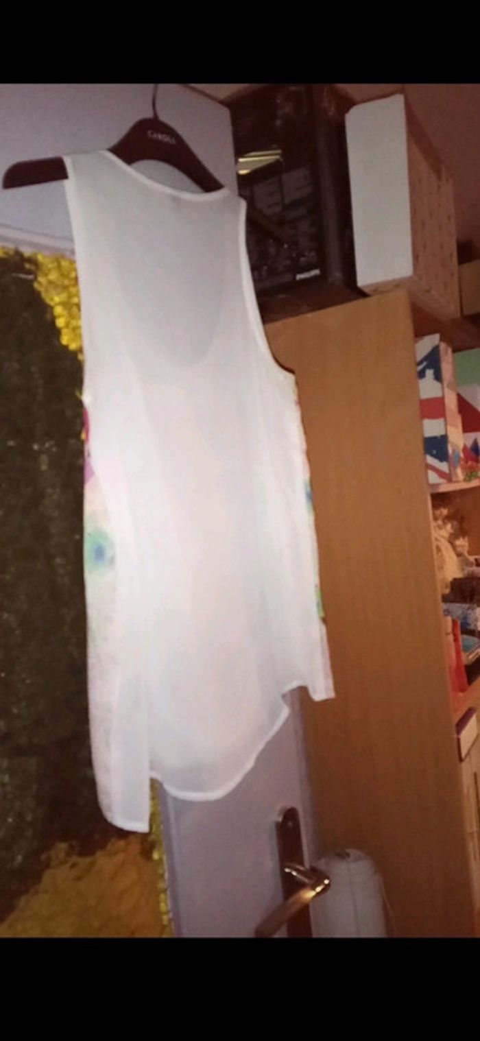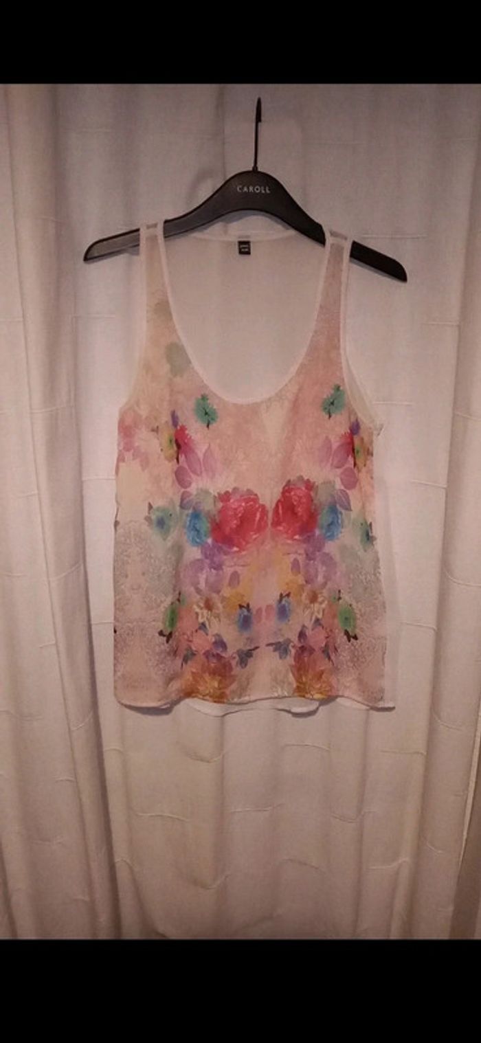 100 % polyester sur le devant fleurs roses, au verso le top est uni blanc