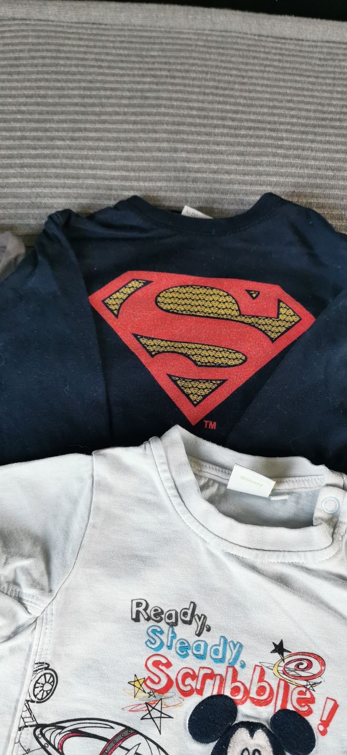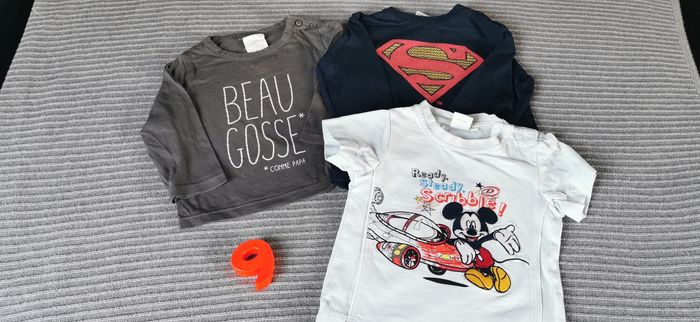 Vends lot de 3 tee-shirt taille 9 mois en bon état. Ils s'ouvrent par 2 boutons / pressions sur l'épaule pour faciliter l'habillement. Un manche courte bleu ciel mickey. Deux manches longues : un marvel super man bleu marine et un kiabi gris avec mention " beau gosse comme papa".