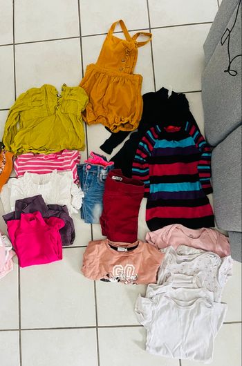 Lot été fille 3 combishort 1 salopette en jean 5 robes 3 tshirts MC 3 bodies MC 2 leggings 2 shorts 2 maillots de bains dont 1 avec bonnet 1 t-shirts ML protection solaire 3 bobs Quelques chaussettes 1 sweat avec 1 petite tache de feutre 1 bavoir plastique avec manches Lavable un peu use