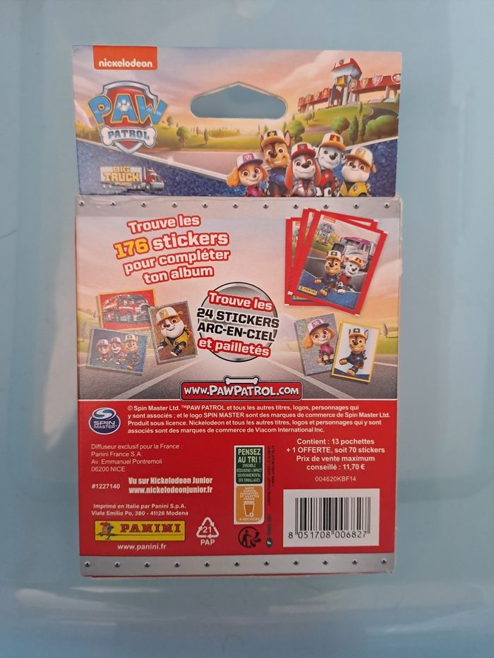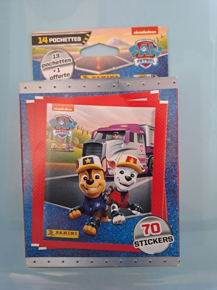 Boîte de 14 pochettes, soit 70 stickers Pat patrouille Big trucks panini. Neuve, jamais ouverte.