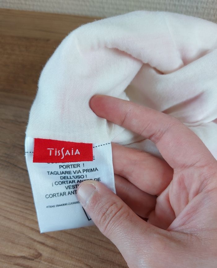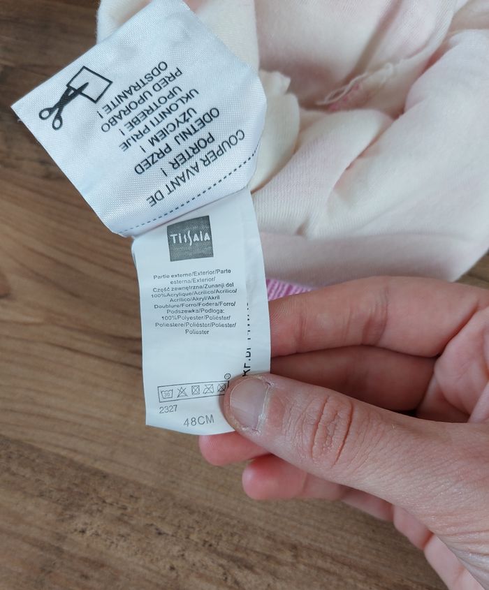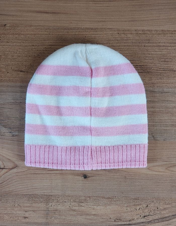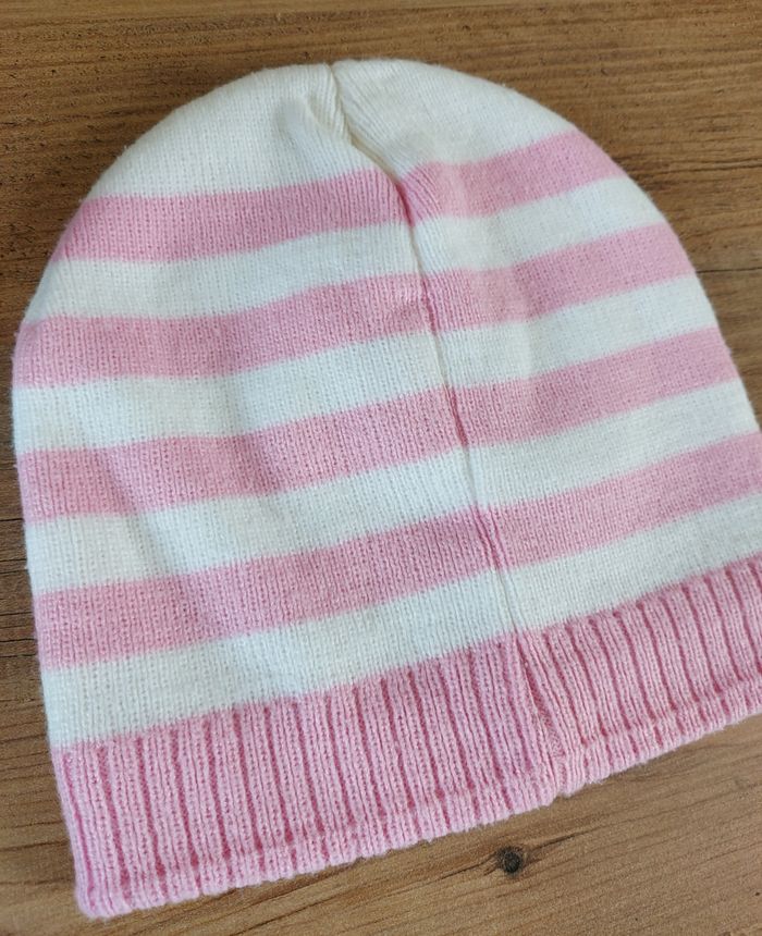 Je vends un bonnet rayé rose et blanc de la marque Tissaia. Taille : 48 cm. Neuf, jamais mis (antivol encore présent).