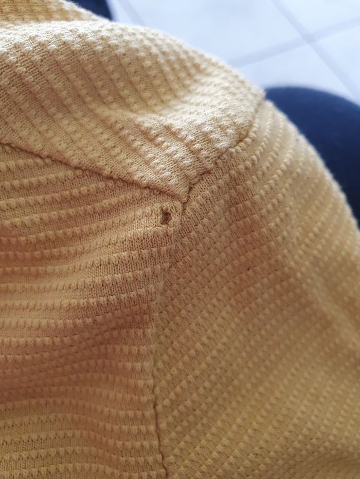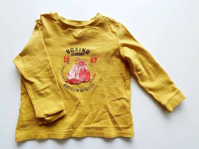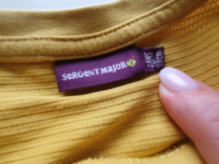 Tee-shirt Sergent Major Taille 3 ans Coloris jaune moutarde avec motif ⚠️ article en très bon état, mais reçu avec un petit trou vers la couture de l'épaule gauche (voir dernière photo)