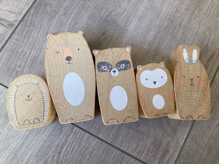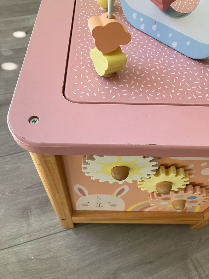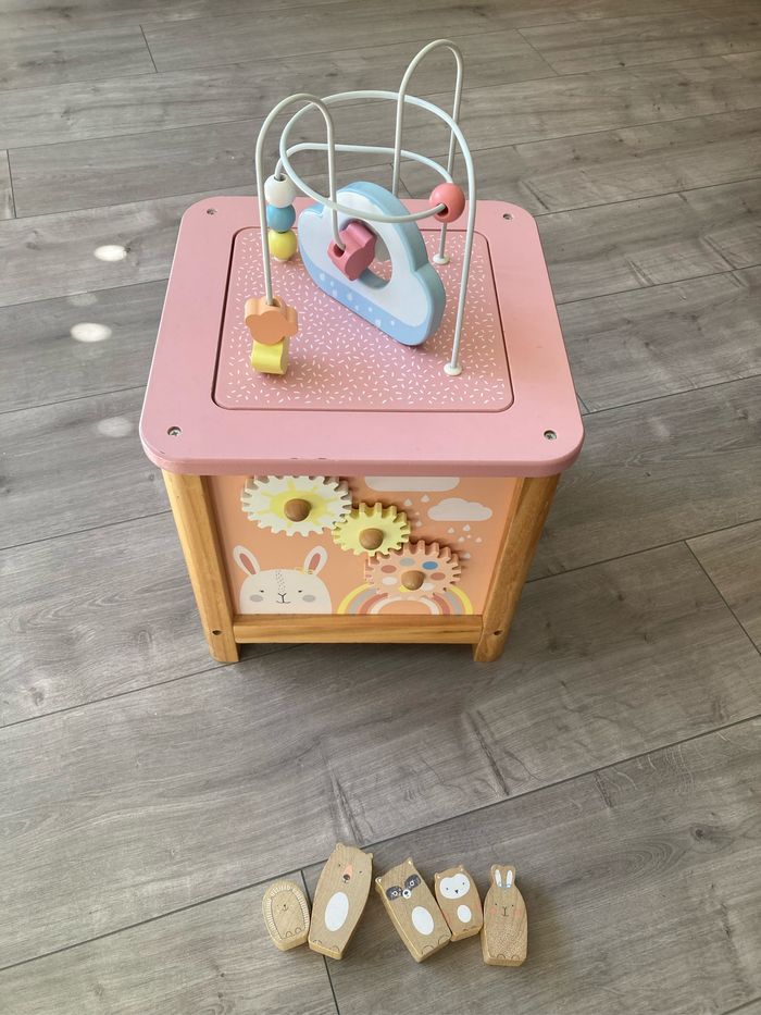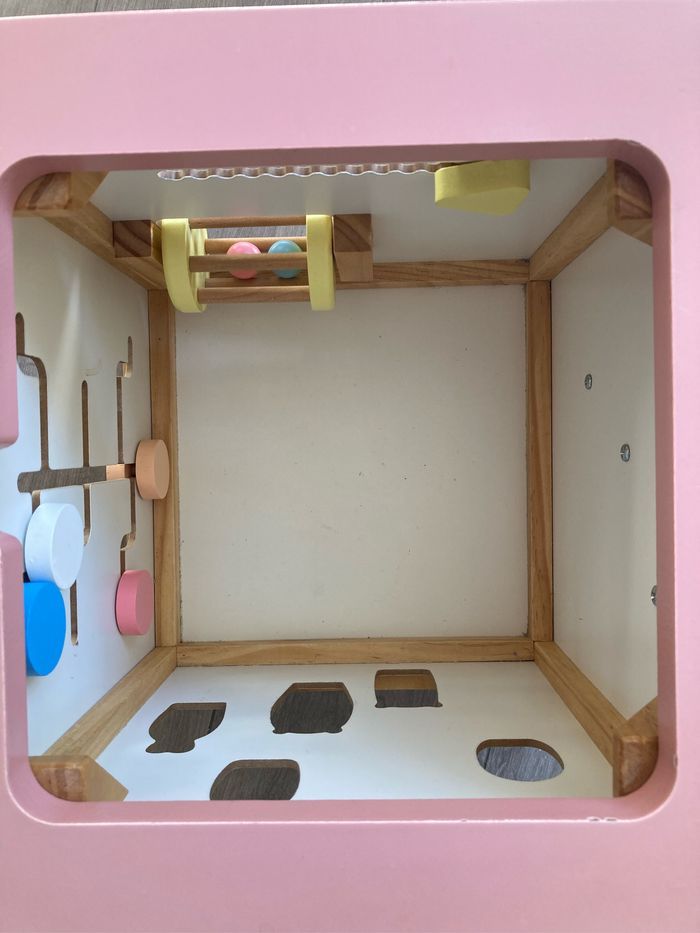 Cube d’activité rose en bois Verbaudet Quelques traces d’usures sur la peinture des personnages et quelques accros de peinture sur le cube (voir photo 4).