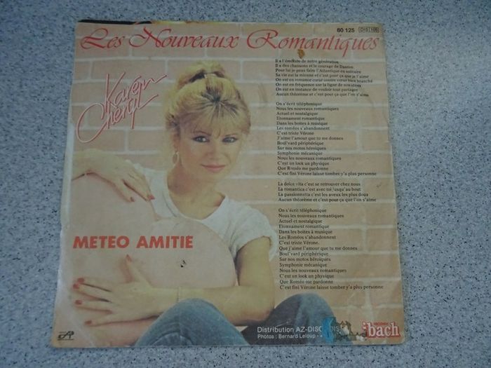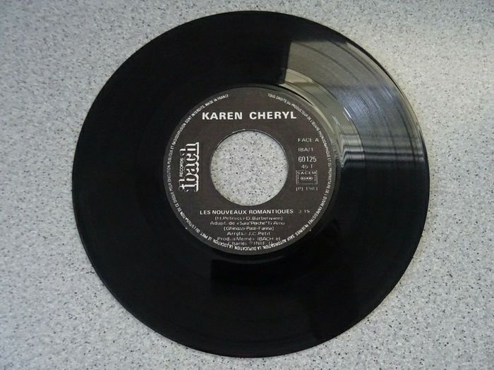 Disque 45 Tours Chanteur : Karen Cheryl 1ère face : Les nouveaux romantiques 2ème face : Météo amitié Article satisfaisant ; disque en excellent état de marche et pochette pas terrible (voir photo) Possibilité d'envoyer d'autres photos sur demande Prix 1 euros