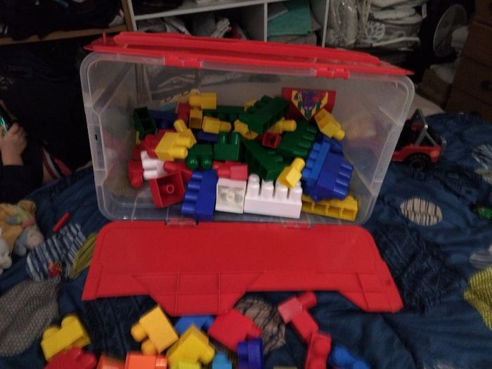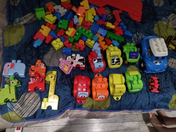 Gros legos avec voitures et animaux à construire, vendu sans la caisse plastique.