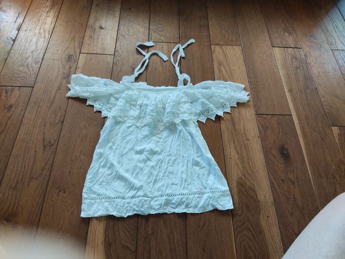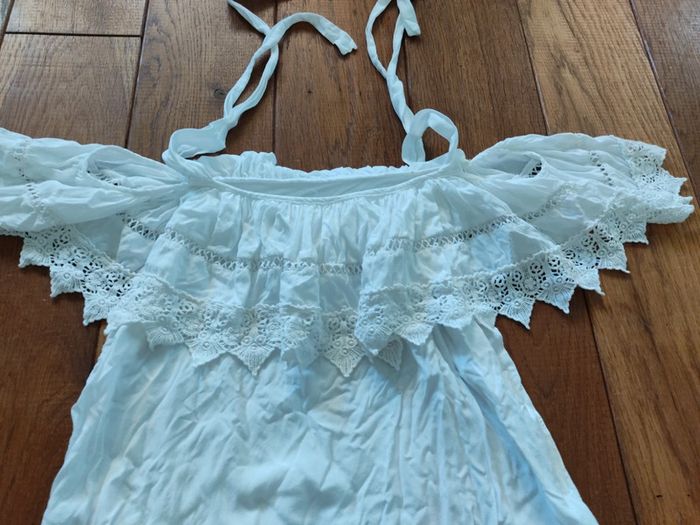 Blouse blanche avec broderies/crochets. Épaules dénudées et broderies qui retombe sur les épaules. Lacets pour noeuds sur les épaules. Très élégante. Taille 38. Très bon état. #mathigelfemme38