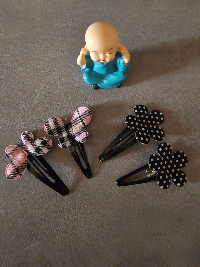 Bonjour 👋 Je vend ce lot : 👉 barette fait main Un bleu noir à poids blanc Une rose et noir motif papillon 🦋 Maison 🏚 non fumeur et sans animaux