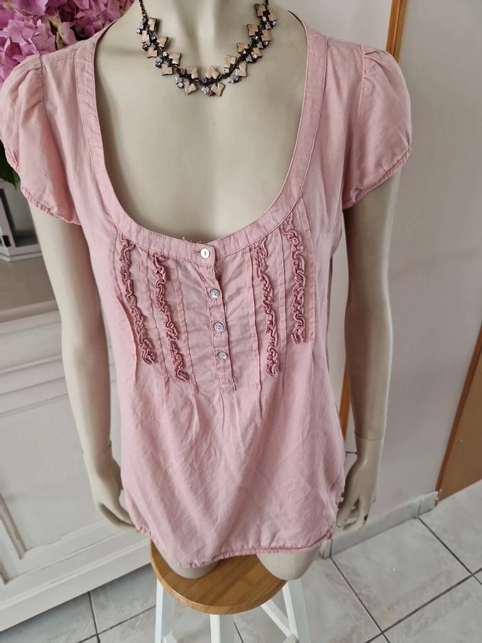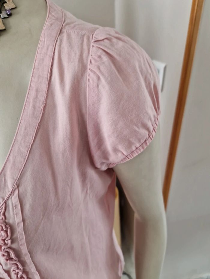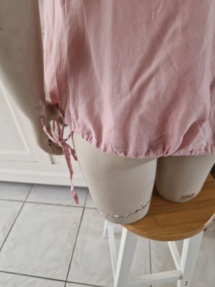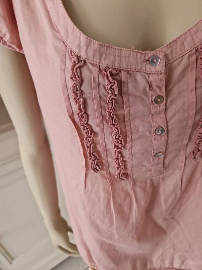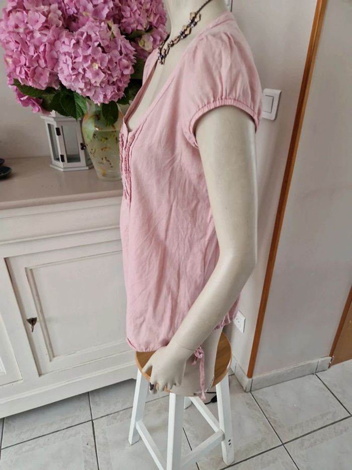 Jolie blouse de couleurs vieux rose avec des manches courtes. Rangée de boutons nacrés bordé de fronces sur les côtés. Lien de serrage en bas de la blouse. Se porte serré ou lâche. 100% coton. #ellaben_blousesfemmes #ellaben_articleszara
