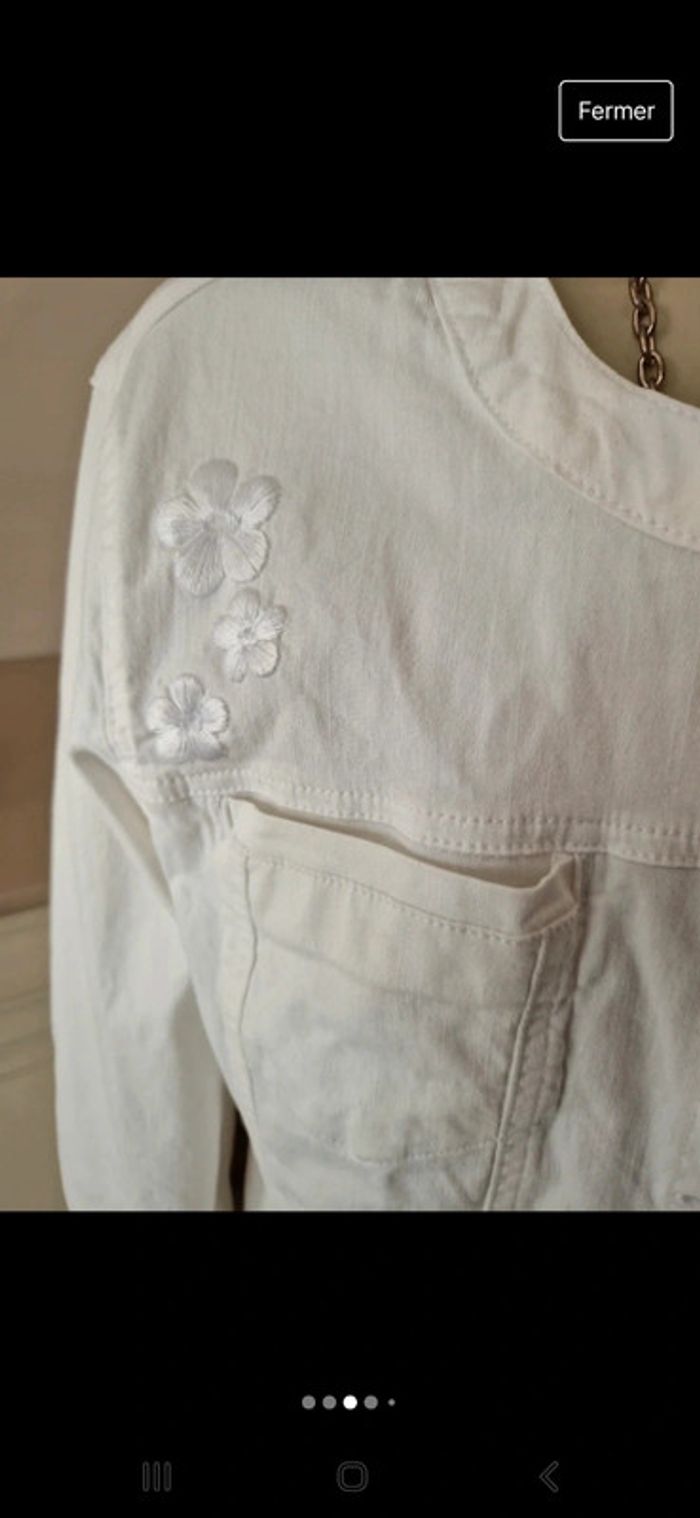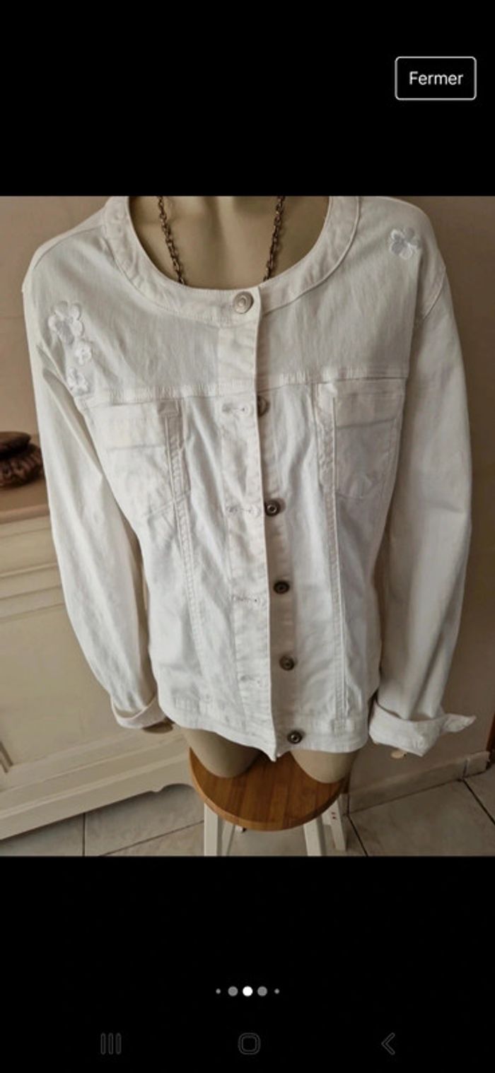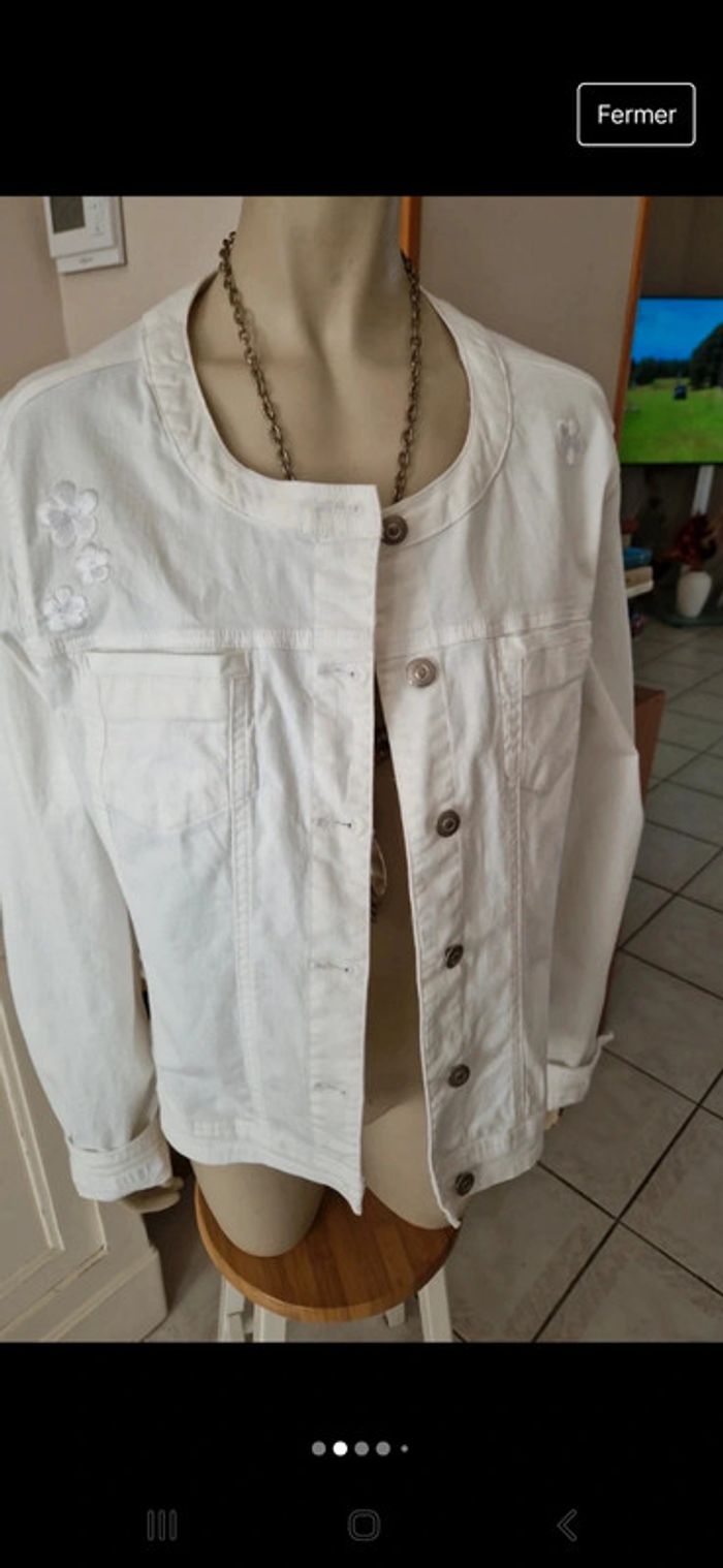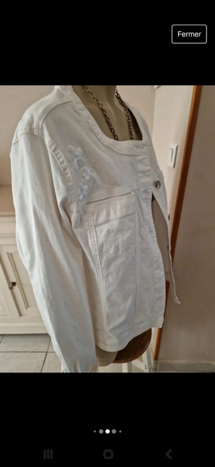Jolie veste blanche brodée avec deux poches à la poitrine . Manches longues qui se ferment par des boutons métalliques. Possibilité de resserré la veste avec un système de boutons à la taille. Veste 97 % coton et 3% élasthanne Jolie et très pratique. Taille 40/42 #ellaben_vestesfemme #ellaben_grandestailles #ellaben_blanc