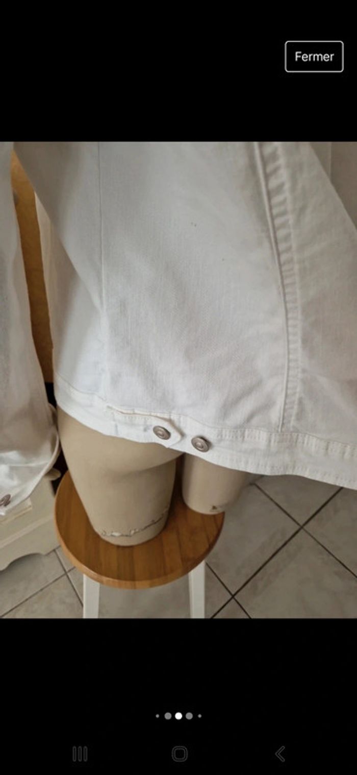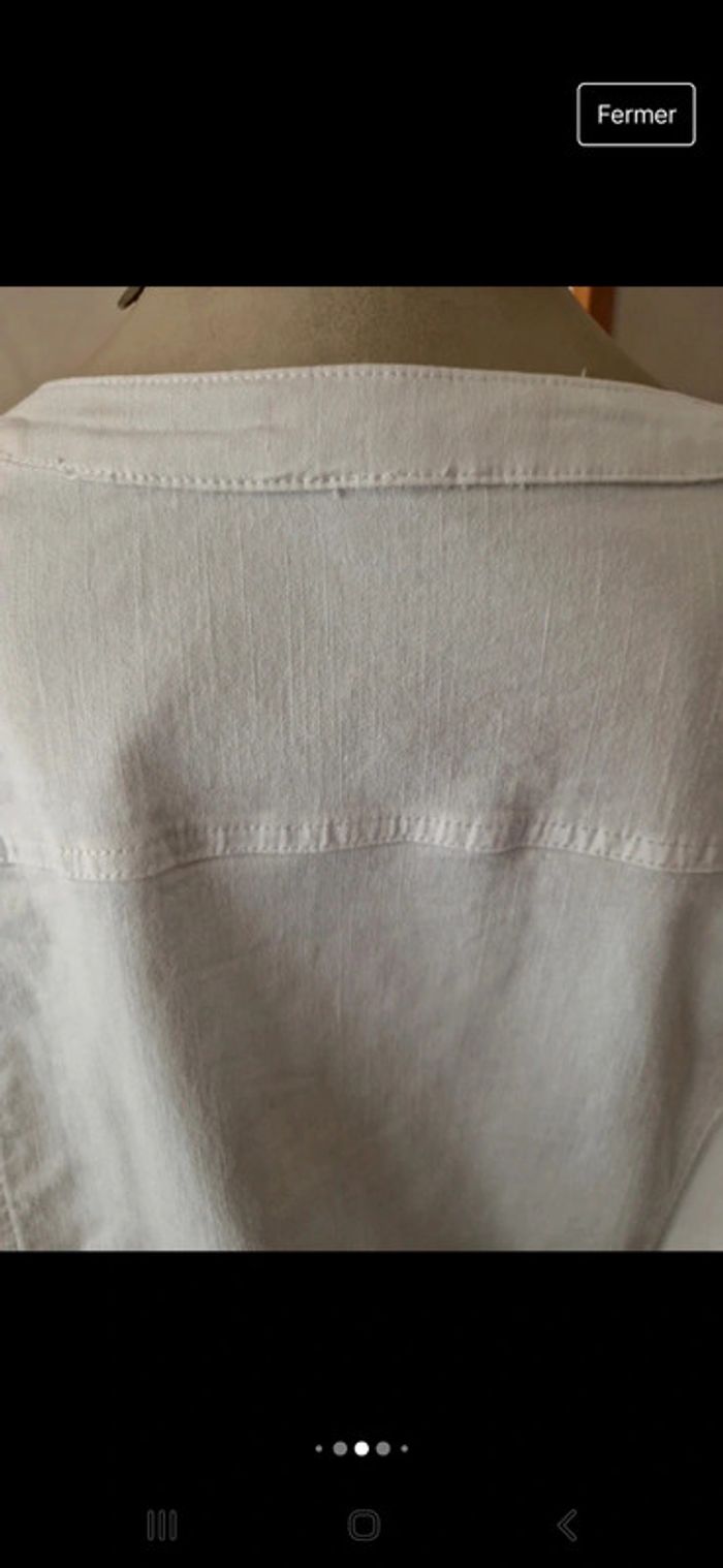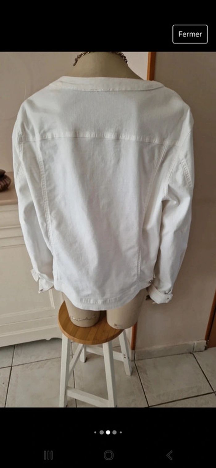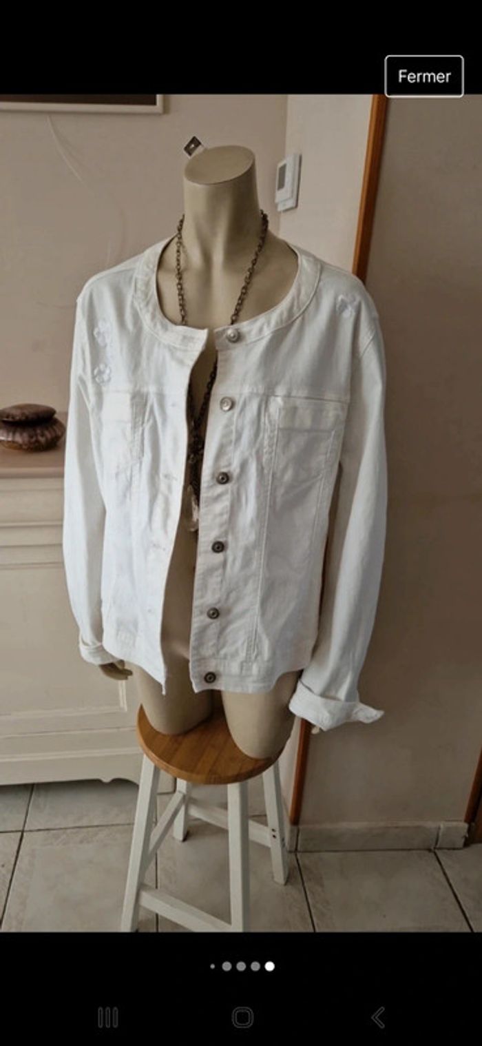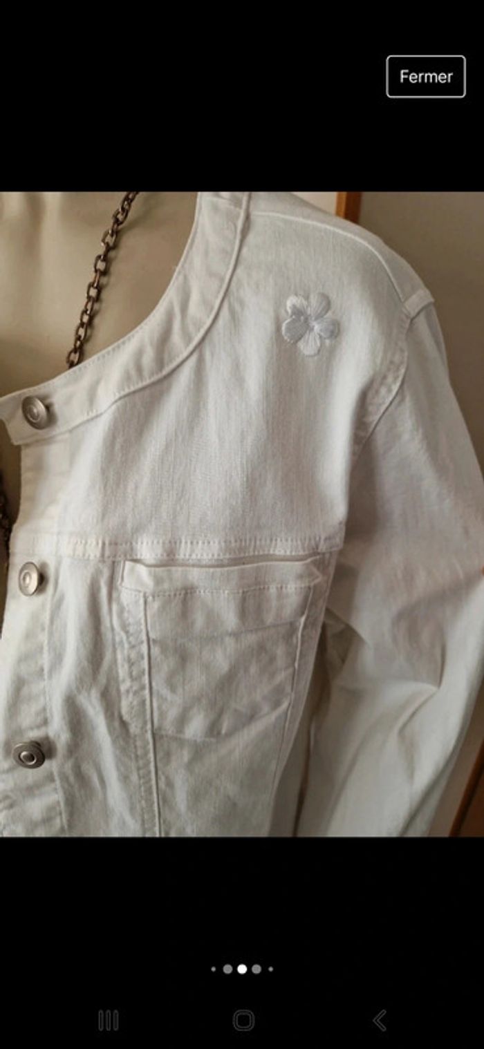 Jolie veste blanche brodée avec deux poches à la poitrine . Manches longues qui se ferment par des boutons métalliques. Possibilité de resserré la veste avec un système de boutons à la taille. Veste 97 % coton et 3% élasthanne Jolie et très pratique. Taille 40/42 #ellaben_vestesfemme #ellaben_grandestailles #ellaben_blanc