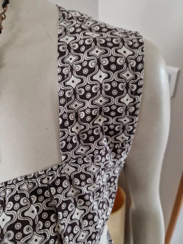 Jolie tunique manches courtes avec un décolleté carré et un bustier froncé. Une ceinture de couleur taupe qui se noue dans le dos. Élégante et originale cette tunique. Taille 2 qui correspond à un 38/ 40 100% coton. #ellaben_blousesfemmes