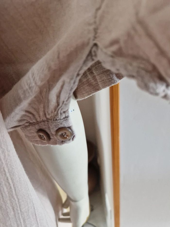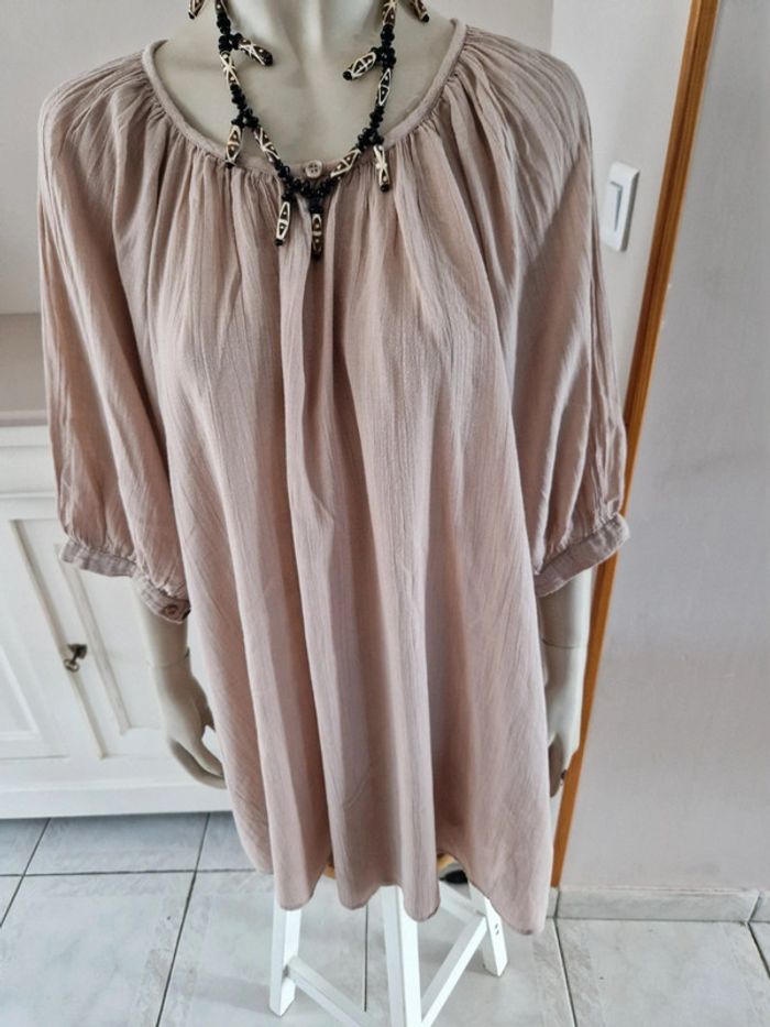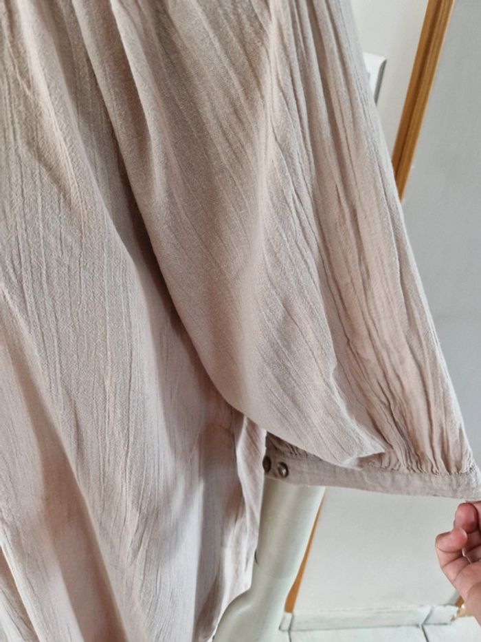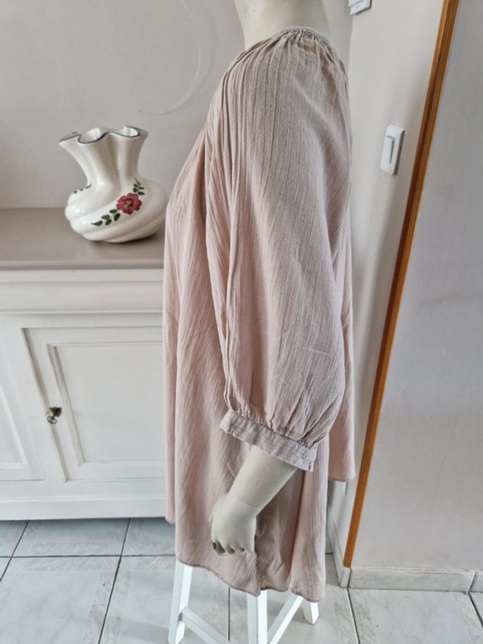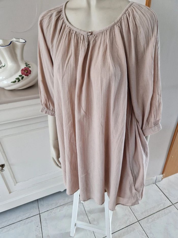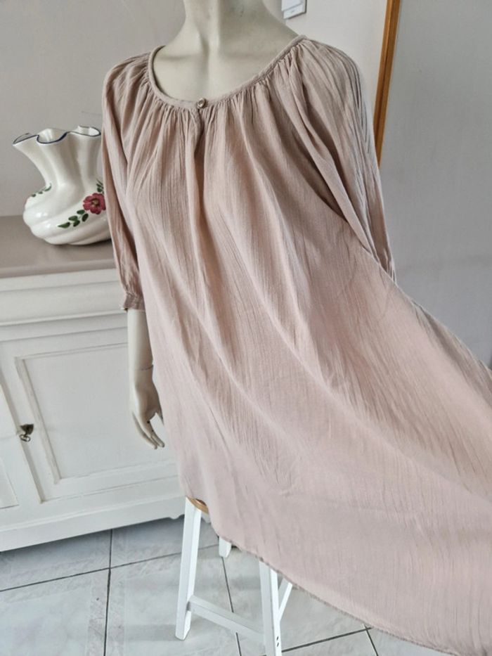 Jolie robe tunique de couleur beige. Encolure ronde fermée par u bouton. Manches trois quarts avec double bouton. Bouton de rechange sur l'étiquette. Robe 100% coton #ellaben_robes