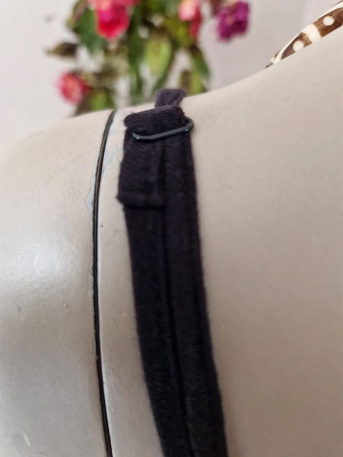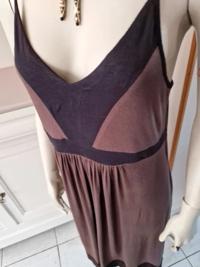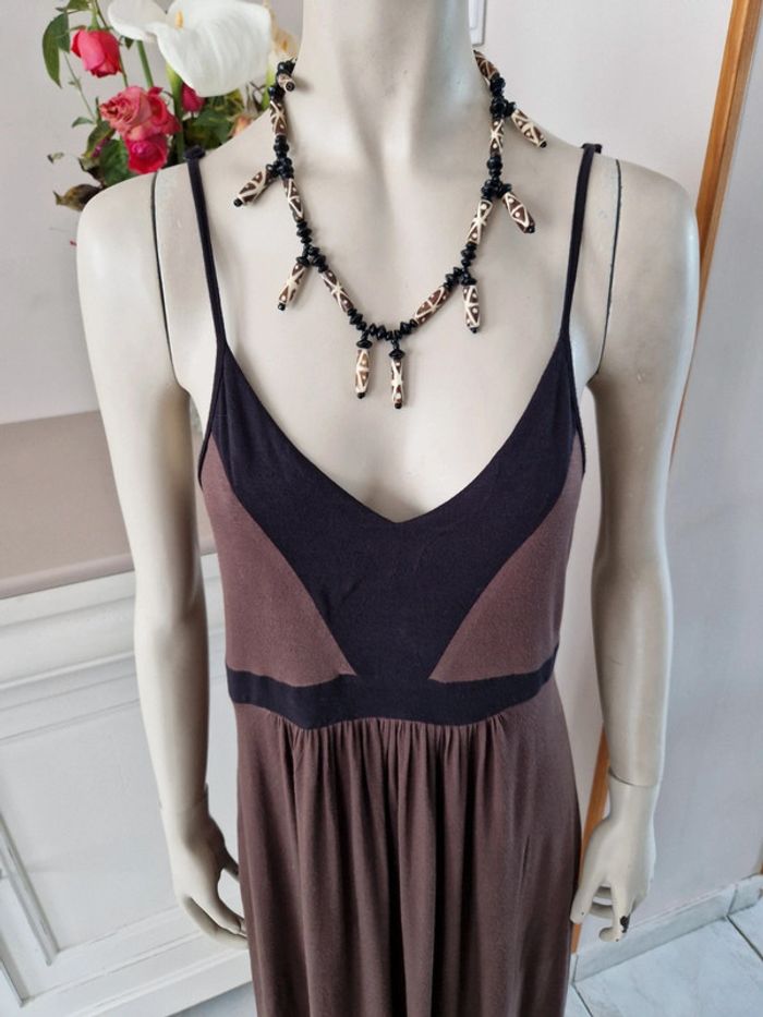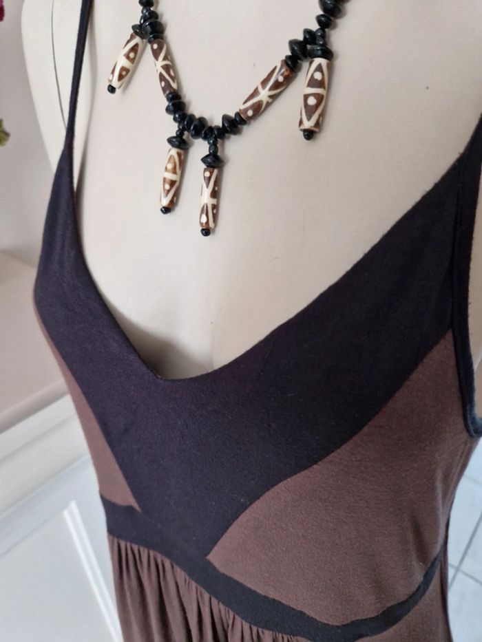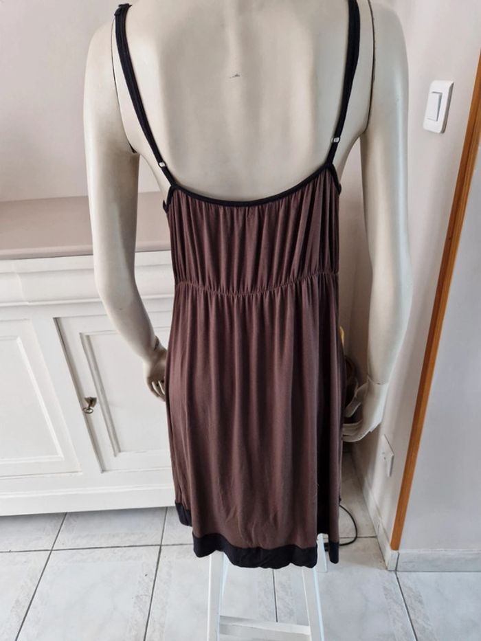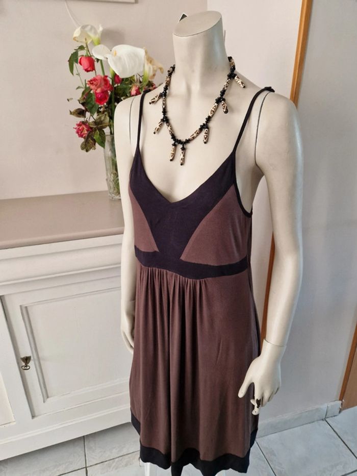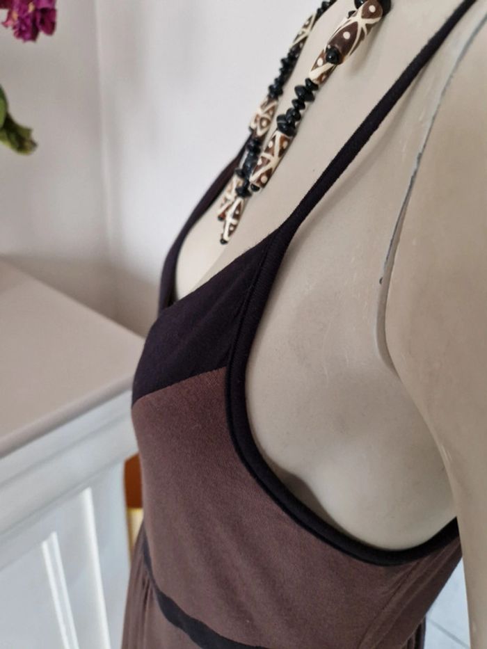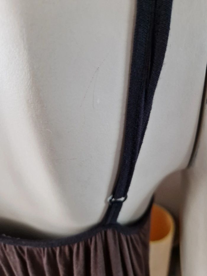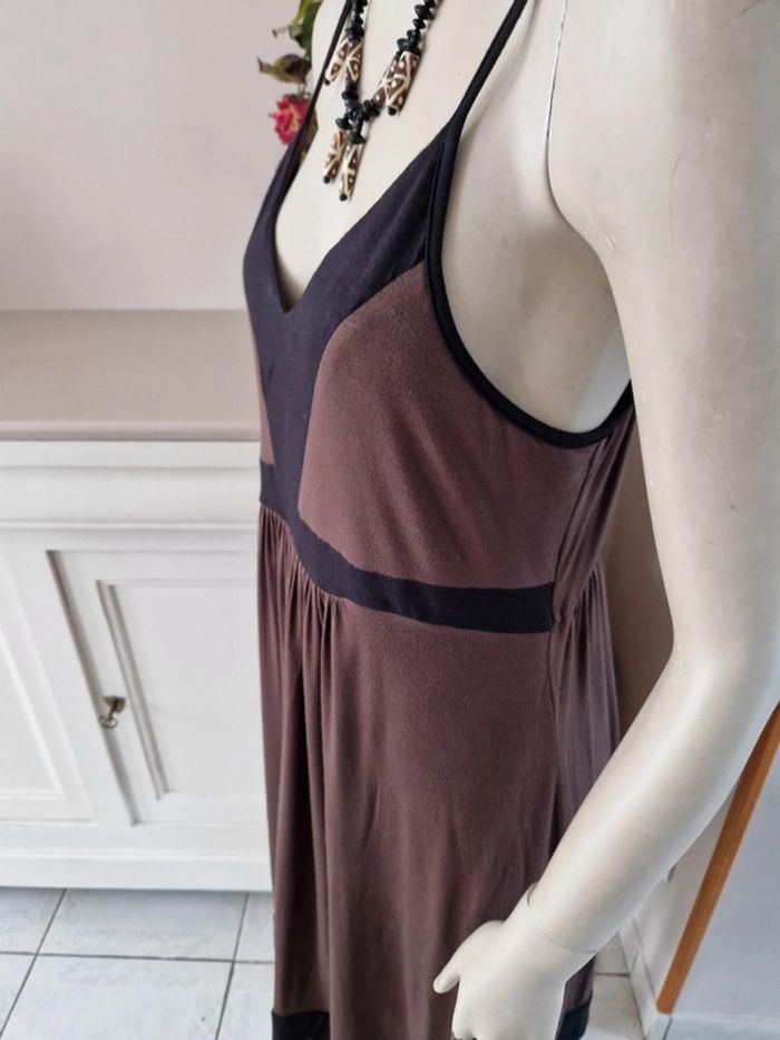 Jolie robe marron et noire avec des bretelles qui se règlent facilement. Élastique à la taille. Décolleté en V. Robe agréable à porter . Tissus 95 % viscose. #ellaben_robes