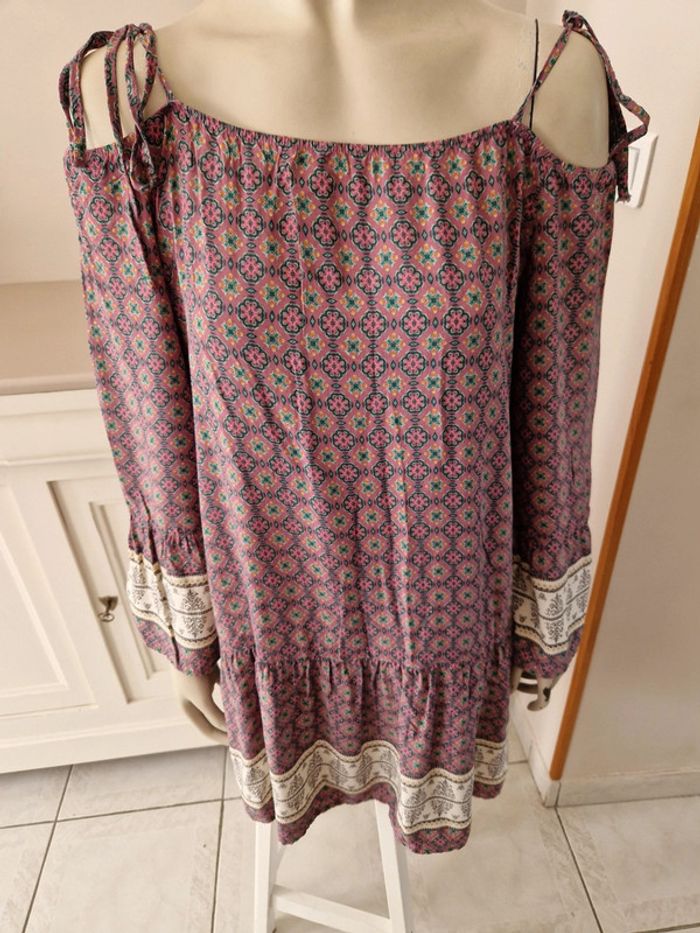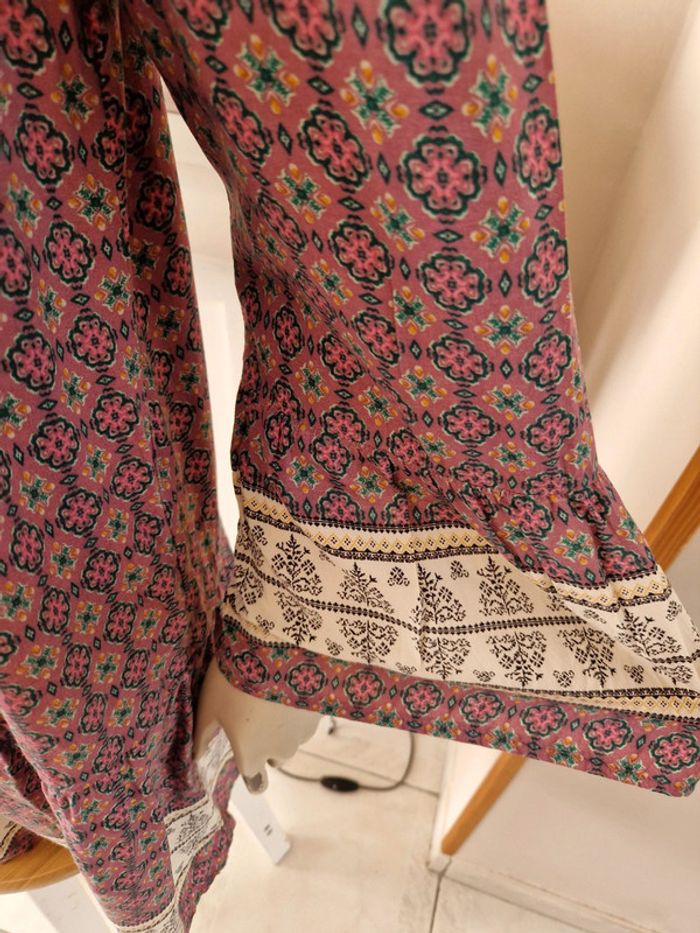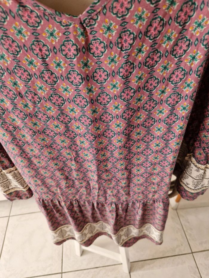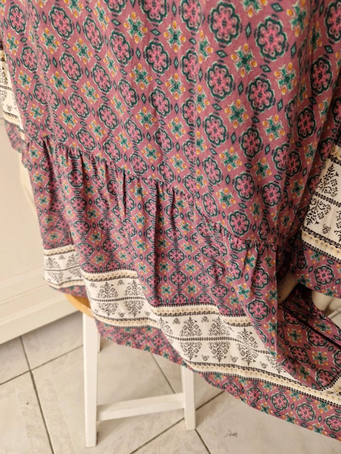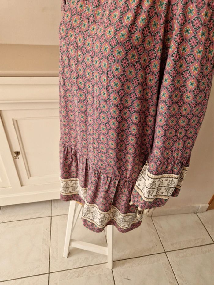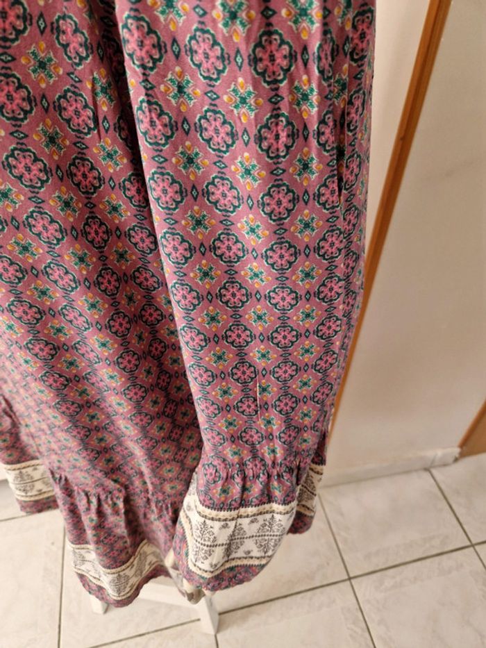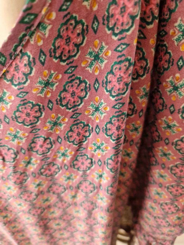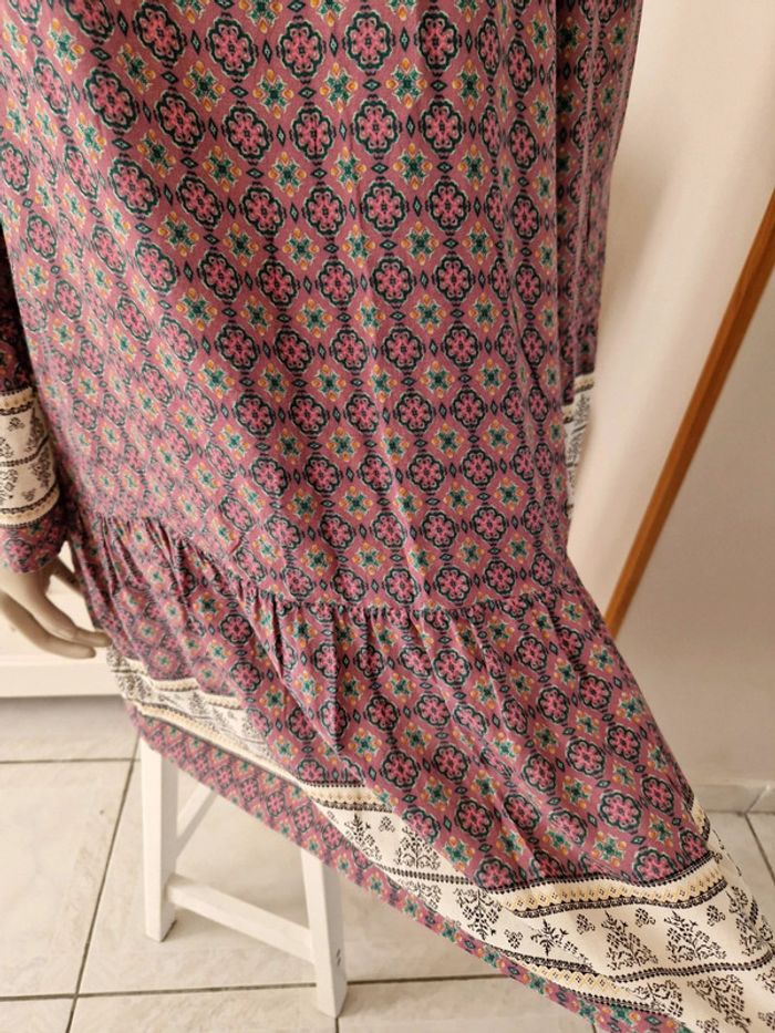 Jolie robe dans les tons vieux rose avec des manches longues qui commencent aux épaules. Robe avec des lacets en tissus. Grand décolleté en V dans le dos. Volant à l'extrémité de la robe. Motifs floral. Tissus léger et très fluide. Coupe de la robe originale. Tissus 100%viscose. Robe quasiment neuve. #ellaben_robes