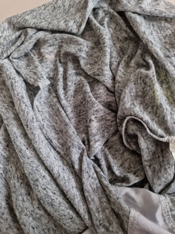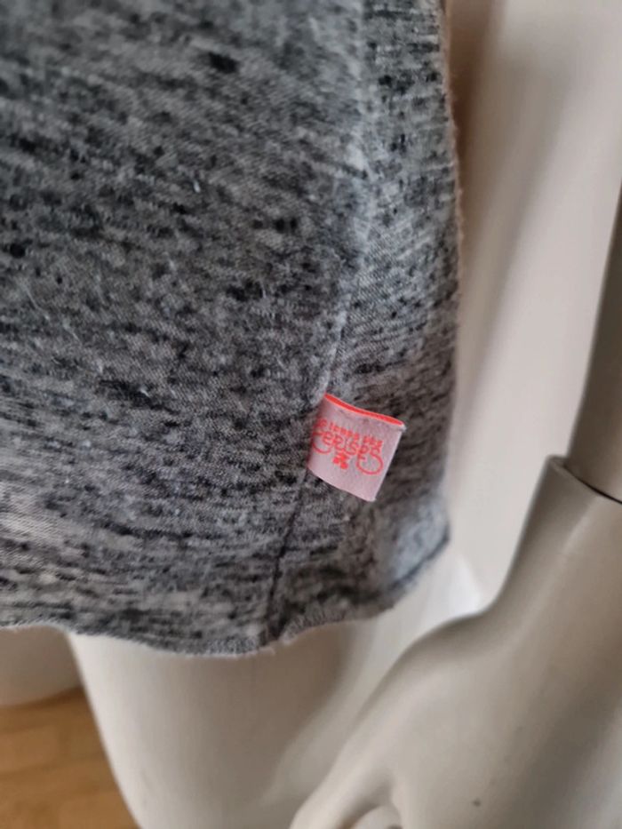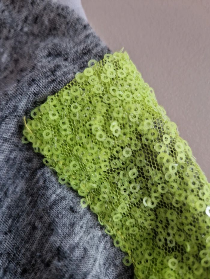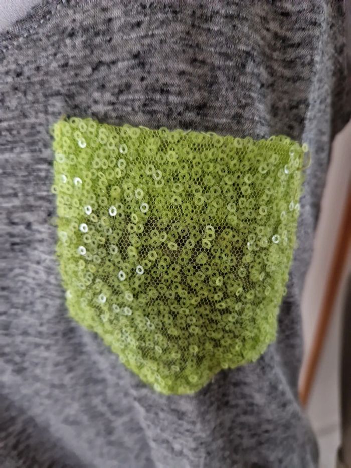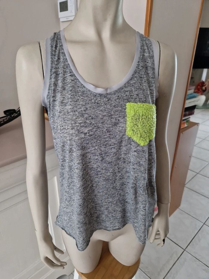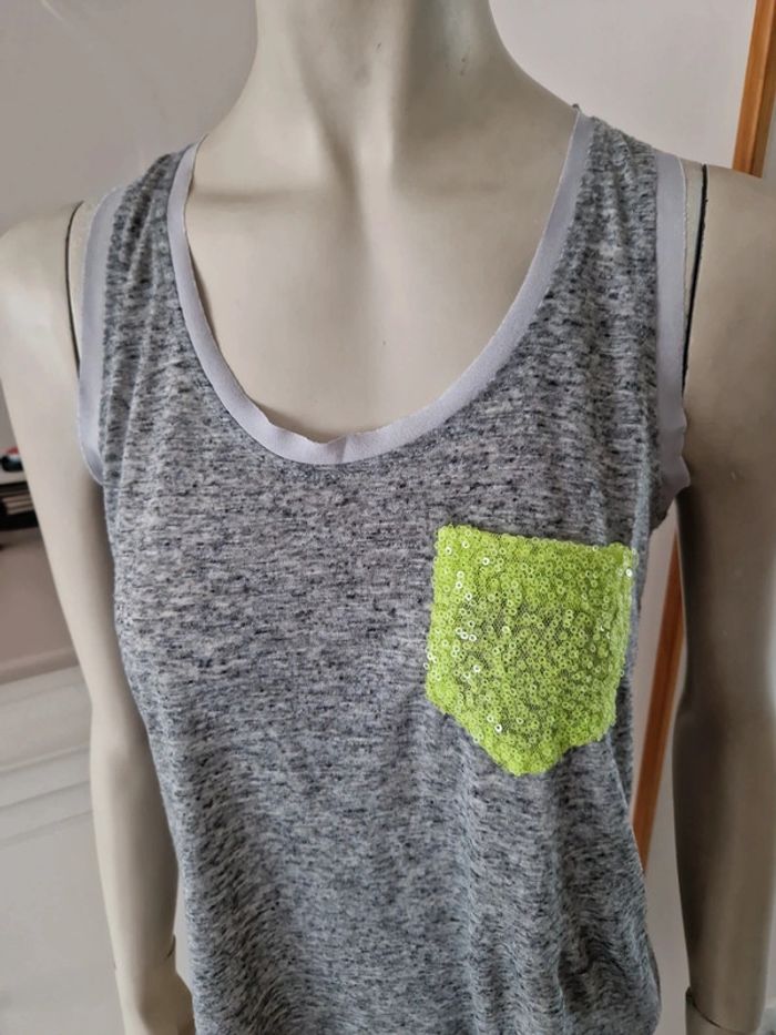 Débardeur gris chiné avec une poche en strass fluo sur la poitrine. Encolure et entourage des manches avec un tissus gris. Bande grise également dans le dos. Logo de le marque sur le bas du T-chirt de fabrication Française. #ellaben_tchirtfemme