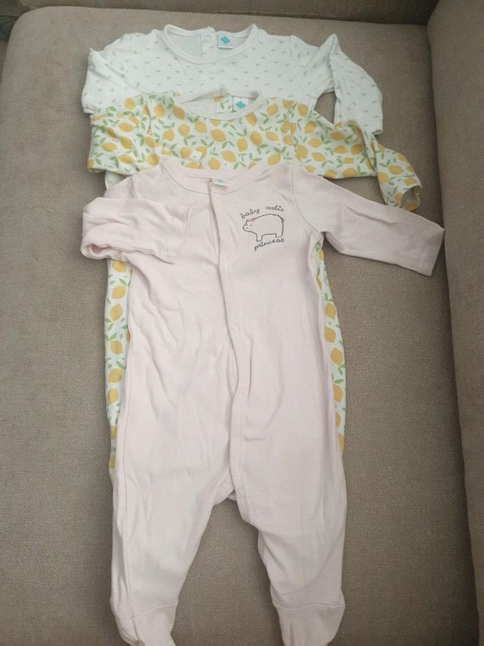 Lot de 3 pyjama tex 9 mois. Le pyjama citron a des "reflets rosés à l'arrière " (voir photo)
